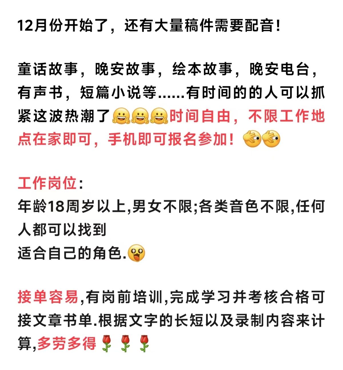 12月8日,记者在某微信公众号看到标题为《配音兼职:188/篇,在家即可做,时间自由》的广告,宣称12月有大量稿件需要配音,涵盖童话故事、有声书、短篇小说等多种类型,强调“不限经验、手机报名、多劳多得”“绝不存在随意扣押工资”。