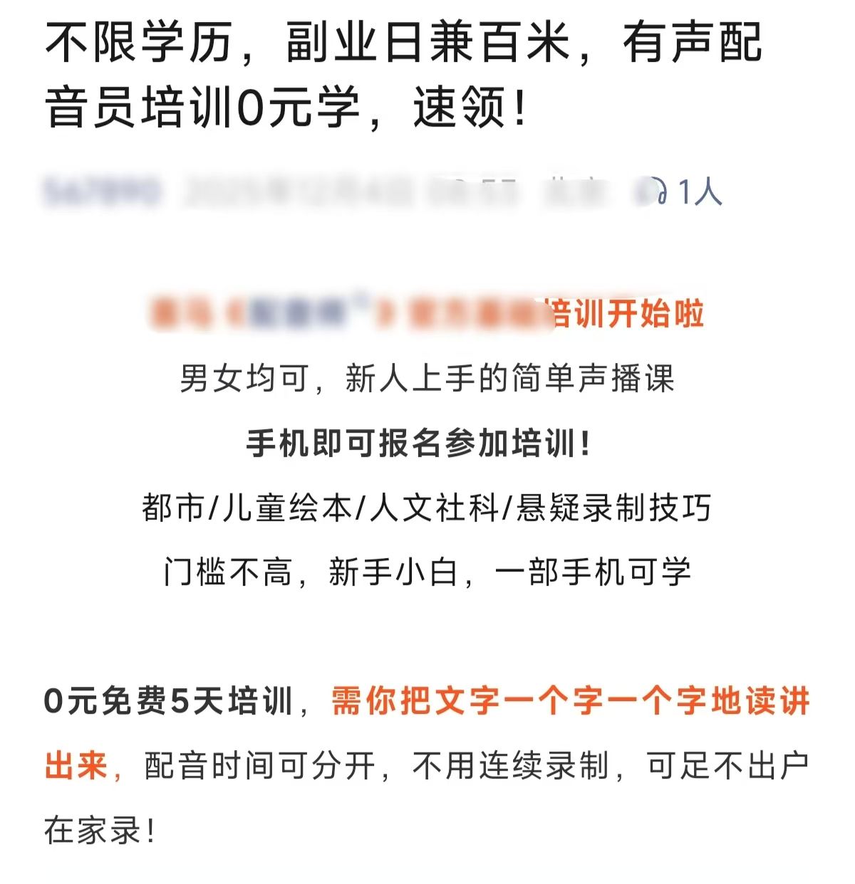“在家就能做,188元/篇,一部手机就能报名”“0元入门配音,月入过万不是梦”……打开微信公众号、短视频平台,常见诸如此类的配音兼职广告。随着有声书、短视频行业的蓬勃发展,“声音变现”成为不少人眼中的香饽饽,尤其吸引着“宝妈”、学生、退休人群以及寻求副业的职场人。