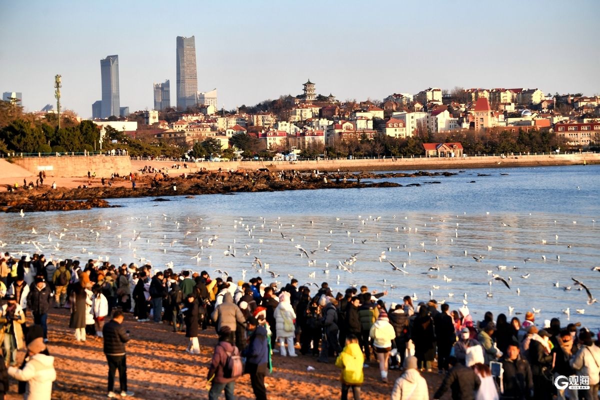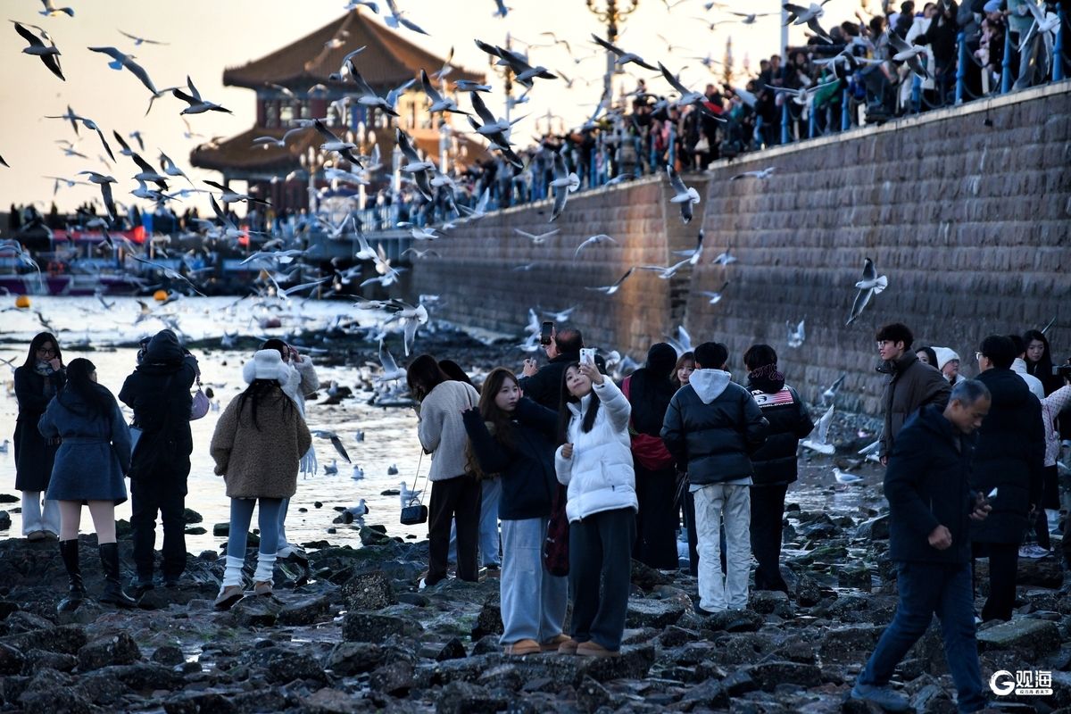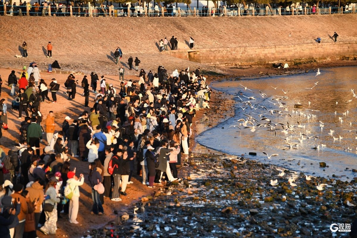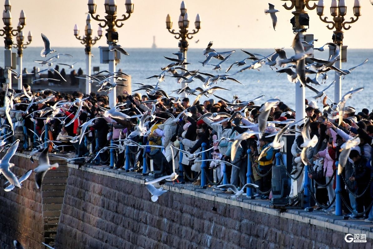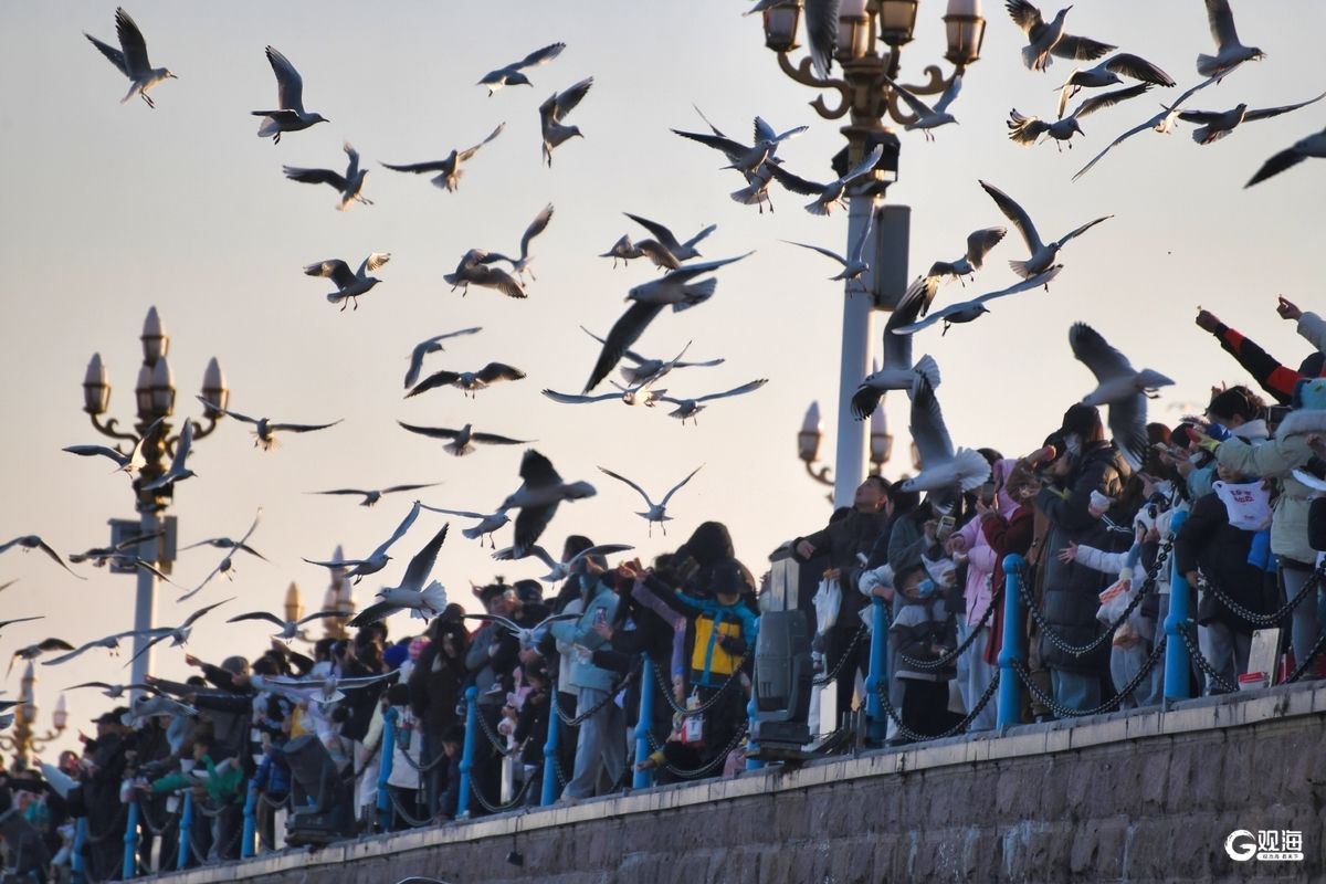 青岛日报社/观海新闻12月14日讯 今天下午,栈桥景区在落日熔金的暮色中,迎来了一天中最富诗意的时刻:数百上千只海鸥翩然起舞,与驻足喂食的游客市民构成了一幅灵动的海滨冬韵图。