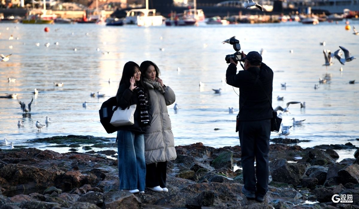 金色夕阳倾泻在百年栈桥与碧波之上,海风裹挟着咸鲜气息。游客们或举家前来,或结伴而行,纷纷掏出准备好的面包、鸥粮,向空中抛撒。成群的海鸥时而展翅滑翔,时而俯冲啄食,雪白的身影在霞光中划出优美弧线。清脆鸣叫、孩童欢笑与海浪声交融,让冬日的海岸线充满生机。