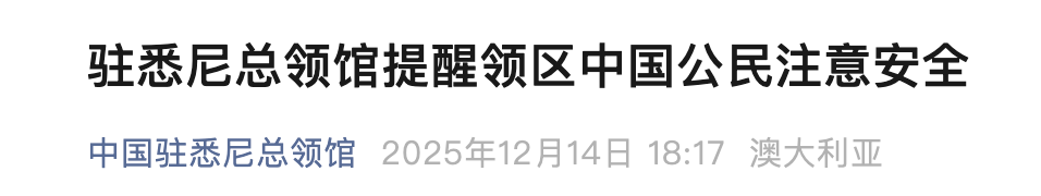发生枪击事件后,中国驻悉尼总领馆提示领区中国公民注意安全。