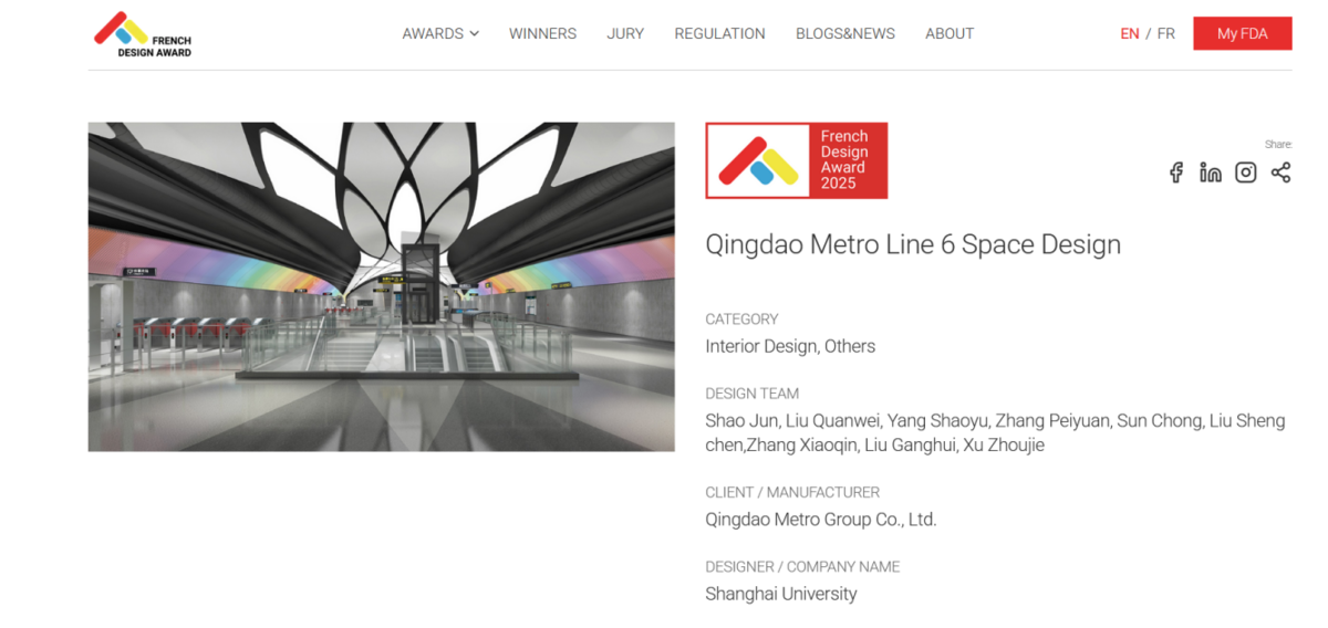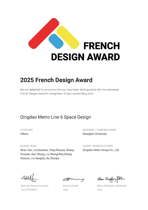 青岛日报社/观海新闻12月15日讯 近日,青岛地铁建设6号线一期工程空间一体化设计,凭借出色的创意表达与深厚的文化内涵,荣获2025年法国设计奖(French Design Awards)。截至目前,6号线一期工程已累计获得多项国内外重要奖项,其中包括国际隧道和地下空间协会(ITA)“超越工程奖”、美国缪斯设计奖(MUSE Design Awards)、亚太经合组织(APEC)公共交通科技创新竞赛新成果。此次法国设计奖是该项目获得的第4个国际奖项,进一步彰显了青岛地铁在轨道交通设计方面成果与实力。