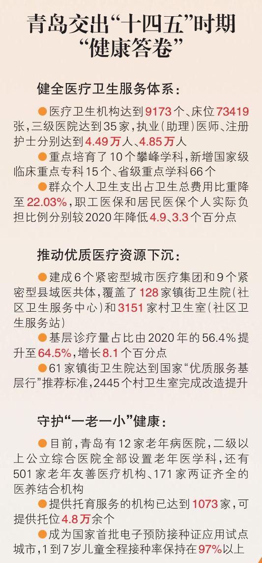 这组以“健康”为底色、饱含民生温度的数字,是青岛在“十四五”时期交出的一份沉甸甸的“健康答卷”,也是青岛深入贯彻“大卫生、大健康”理念,以国家首批公立医院改革与高质量发展示范项目为契机,加快构建优质高效医疗卫生服务体系,全方位、全周期保障人民健康的生动实践。