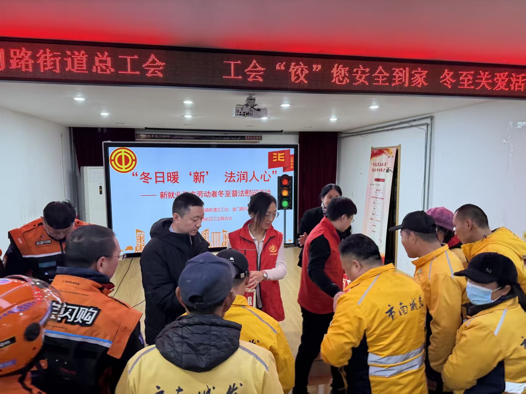 冬至阳生,岁回律转。为切实关爱新就业形态劳动者,提升其道路交通安全意识,让奔波在寒冬里的户外工作者感受到“娘家人”的温暖,12月19日,金门路街道总工会联合街道司法所在仙游路社区举办“工会‘饺’您,安全到家”冬至主题普法慰问活动,将节日的温暖与实实在在的安全知识送到快递小哥、外卖骑手、环卫工人等新就业群体的手中和心坎上。