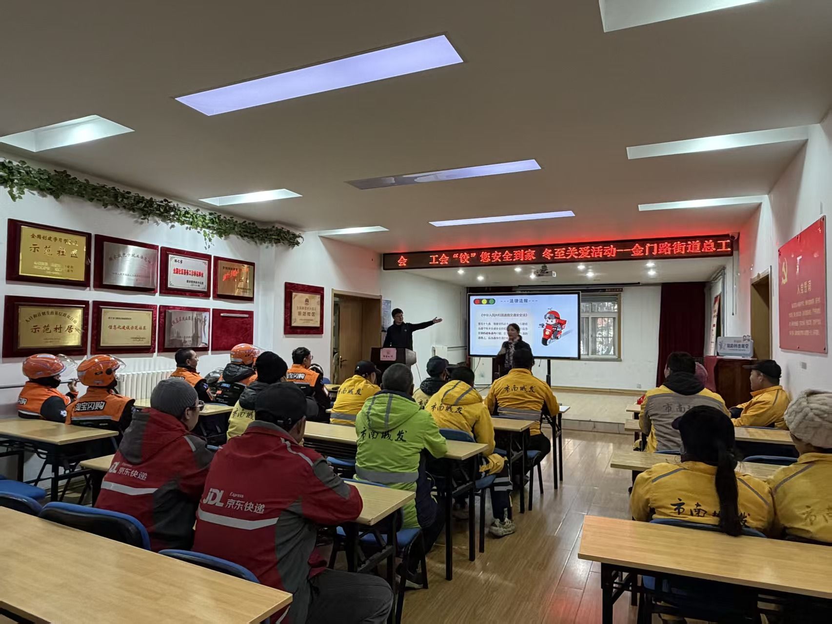 活动伊始,工会特意为“掐着点”跑单的骑手们安排了一场“短而精”的道路交通安全普法讲座。街道司法所工作人员指出,《电动自行车安全技术规范》新国标实施后,大家务必确保电动车有脚踏骑行功能、最高设计车速不超过25km/h、注意整车重量等。结合辖区典型交通事故案例,聚焦骑行中看手机、抢行、不佩戴头盔等常见安全隐患,用通俗易懂的语言讲解了相关交通法规及其背后的安全逻辑。“平时赶时间,确实会忽略一些小细节,今天听了才知道,每一个‘不小心’都可能酿成大祸。工会送的这份‘安全馅’的礼物,比什么都实在。”一位外卖骑手在参与互动后深有感触地说。