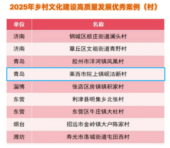 山东省文化和旅游厅近日公布2025年乡村文化建设高质量发展优秀案例名单,莱西市院上镇岘沽新村成功入选,成为青岛市两个上榜村庄之一。