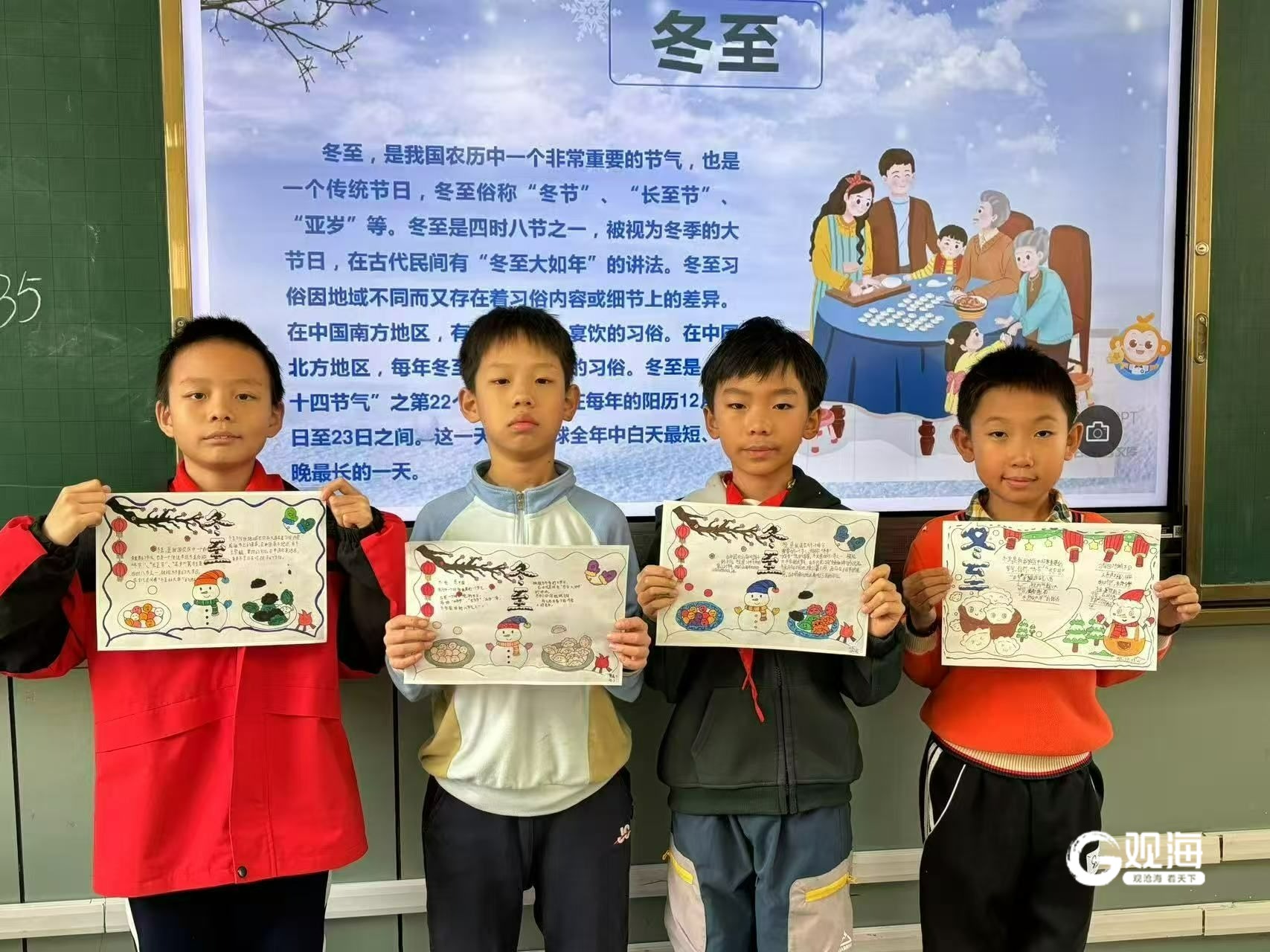 另外,老师们带领学生开启了一场“冬至科学探秘之旅”。借助多媒体课件演示,生动讲解了冬至的天文意义;通过绘制“九九消寒图”,让学生感受冬至到来的物候变化。将传统节气与现代科学知识相结合,从科学视角理解先人节气里的智慧。