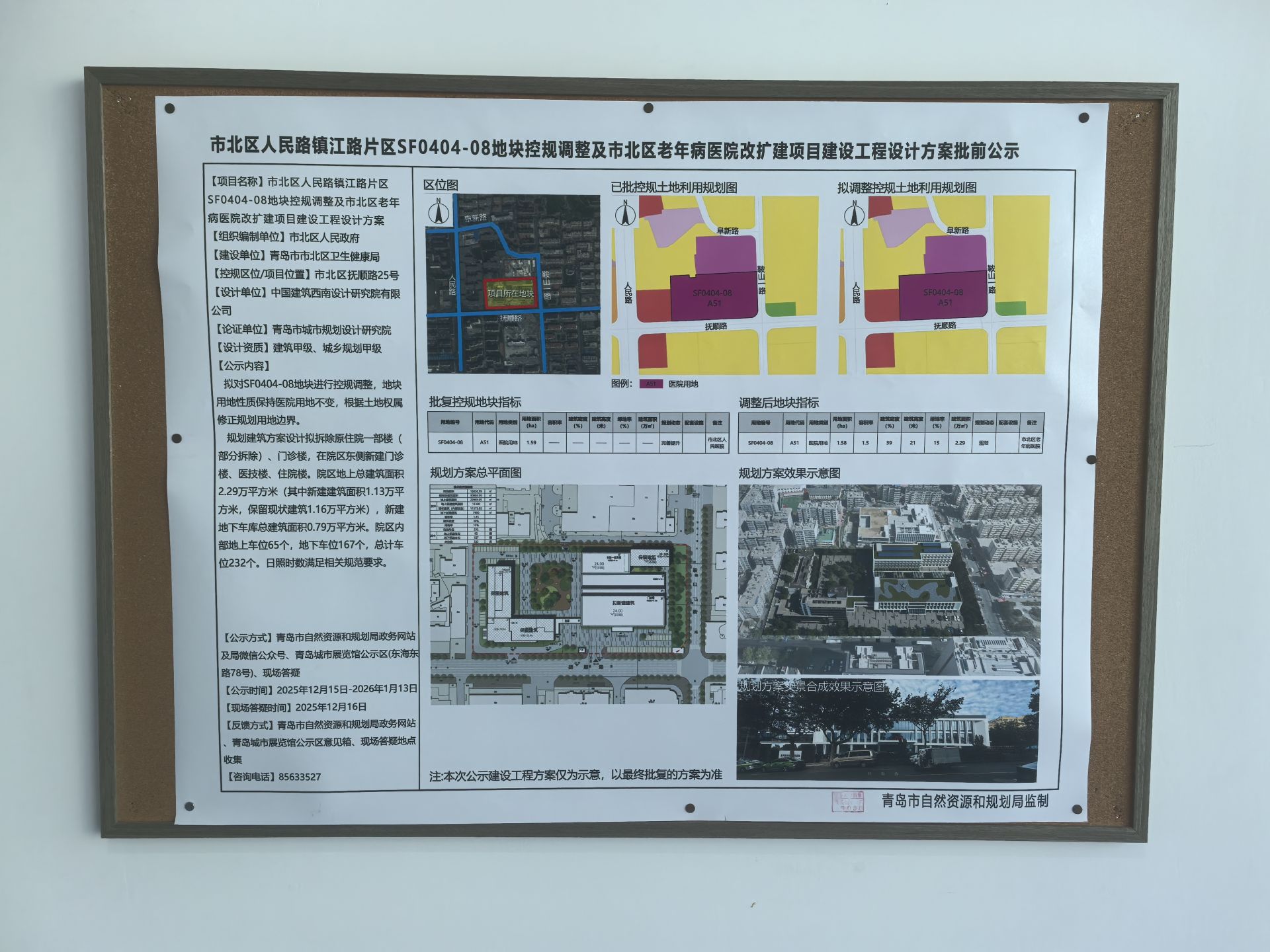 《人民路镇江路片区SF0404-08地块控规调整及青岛市市北区老年病医院(青岛市市北区人民医院)改扩建项目建设工程设计方案》显示,改扩建工程拟拆除原住院一部楼(部分拆除)、门诊楼,在院区东侧新建门诊楼、医技楼、住院楼。院区地上总建筑面积2.29万平方米,其中新建建筑面积1.13万平方米,保留现状建筑1.16万平方米,新建地下车库总建筑面积0.79万平方米。完成后,院区总计车位232个。
