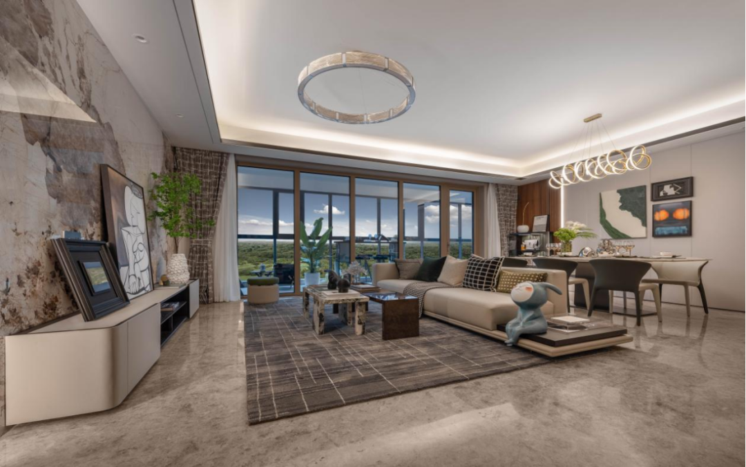 项目聚焦城市精英家庭需求,打造建面约129–321㎡精装大平层,以纯粹改善定位,专注品质。超大横厅设计,面宽可达二十多米,一体化通透格局;全景落地窗引湖光入园,阳台如“空中跑道”,晨可观湖、暮可散步;全屋无楼梯阻隔,主卧至儿童房、老人房动线极短,照护无忧。精装细节融入智能家居(可视对讲、一键呼梯、应急报警),预留全屋智能拓展接口,兼顾当下舒适与未来可能。