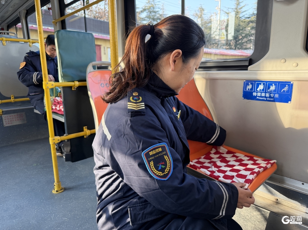 作为一名拥有多年驾龄的老公交人,他深切理解冬季出行的种种不便。于是,没有太多犹豫,他利用个人休息时间,一针一线地手工缝制了多个厚实坐垫,并整齐铺放在车厢座椅上。“当时想法很简单,就是希望乘客能坐得暖和一点,心里也能更舒坦些。”陈海峰回忆道。