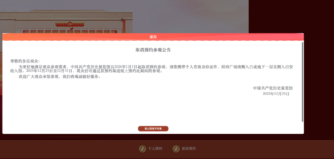 从中国共产党历史展览馆获悉,为更好满足广大观众的参观需求,从2026年元旦起,党史展览馆取消预约参观,观众持本人有效身份证件,经西广场南侧入口或地下一层北侧入口安检入馆(即日起至2025年12月31日,观众可通过原预约渠道线上预约参观)。