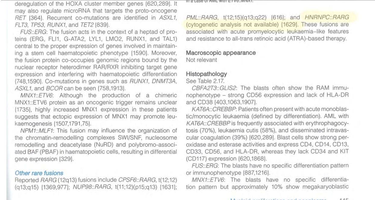 急性早幼粒细胞白血病是目前临床研究最为成熟的一类白血病,绝大多数存在维甲酸受体α(RARA)基因突变形成的融合基因。然而,少数急性早幼粒细胞白血病病例无RARA融合基因,多年来未明确其关键基因突变,导致了部分病例在白血病分类中的归属尚无定论。近十年来,国内外专家陆续在此类病例中发现了其他维甲酸受体(RARG、RARB)的一系列新融合基因,其中包括苏湛等专家团队发现的HNRNPC::RARG融合基因,成功破解了此类病例的致病基因密码。
