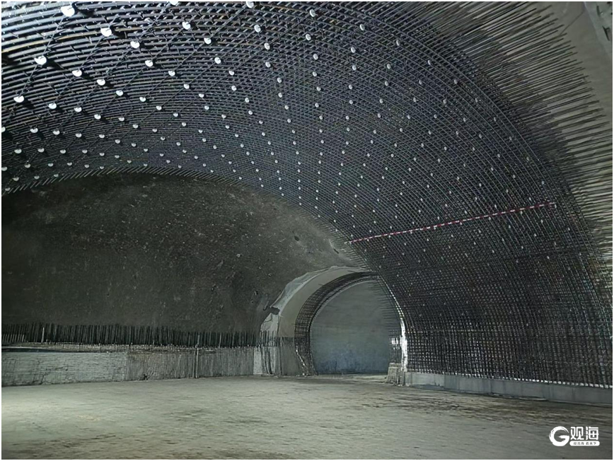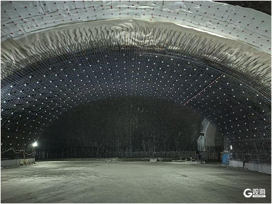 车站内拱墙之上,成排的钢筋纵横交错,像是给隧道撑起了一副黑色的骨架。而那些拳头大小的白色混凝土垫块,正嵌在钢筋的缝隙里——它们本该是毫不起眼的“配角”,隔开钢筋与模板、保证混凝土保护层厚度,是建筑规范里最普通的存在。可当数百个垫块沿着拱顶的弧度铺陈开,灯光扫过的瞬间,竟真的有了“星子垂落”的错觉,深灰的岩壁是夜幕,银黑的钢筋是星河的轨道,而那点点莹白,就是被镶嵌在钢筋骨架里的满天星。