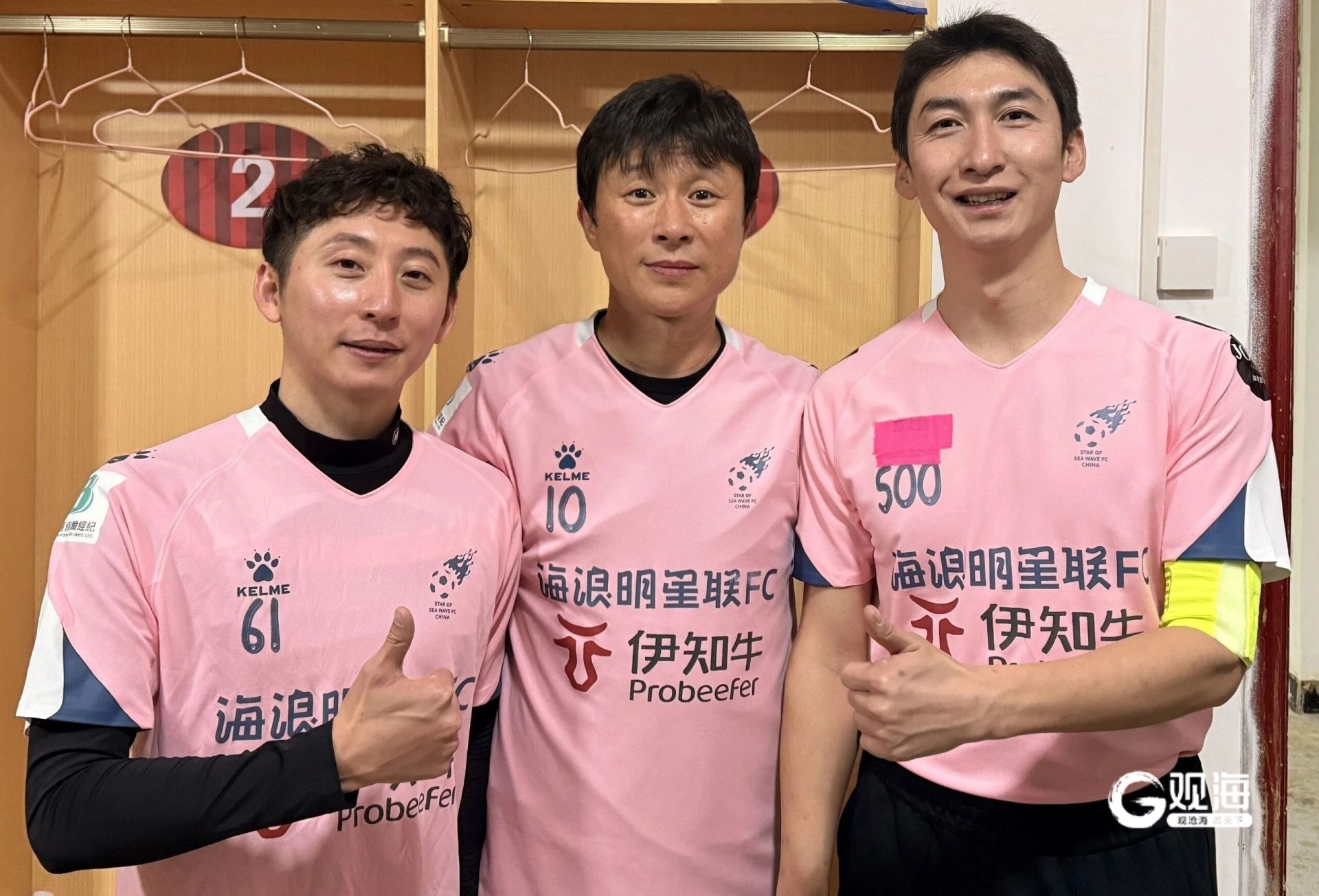前八一队球员、青岛海浪明星联队创始人田野在更衣室内与跳水奥运冠军林跃、冬奥会冠军武大靖合影留念。