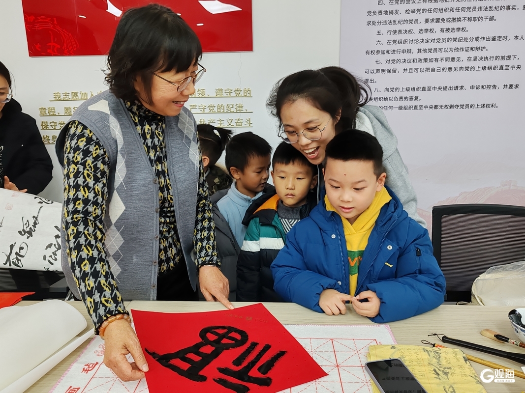 活动特别邀请了燕儿岛路幼儿园小朋友参与其中,在书法家的引导下,孩子们沉浸在握笔、蘸墨、书写体验的快乐中,在红纸上留下充满童趣的笔画。老少同台的温馨互动,既让让小朋友近距离体验了书法魅力,也在潜移默化中促进了传统文化的代际传承。
