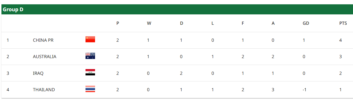 这样,本轮过后,1胜1平的中国队以4分位居小组第一,积3分的澳大利亚队排在第二,而伊拉克队以2分位居第三,泰国队以1分排在第四。