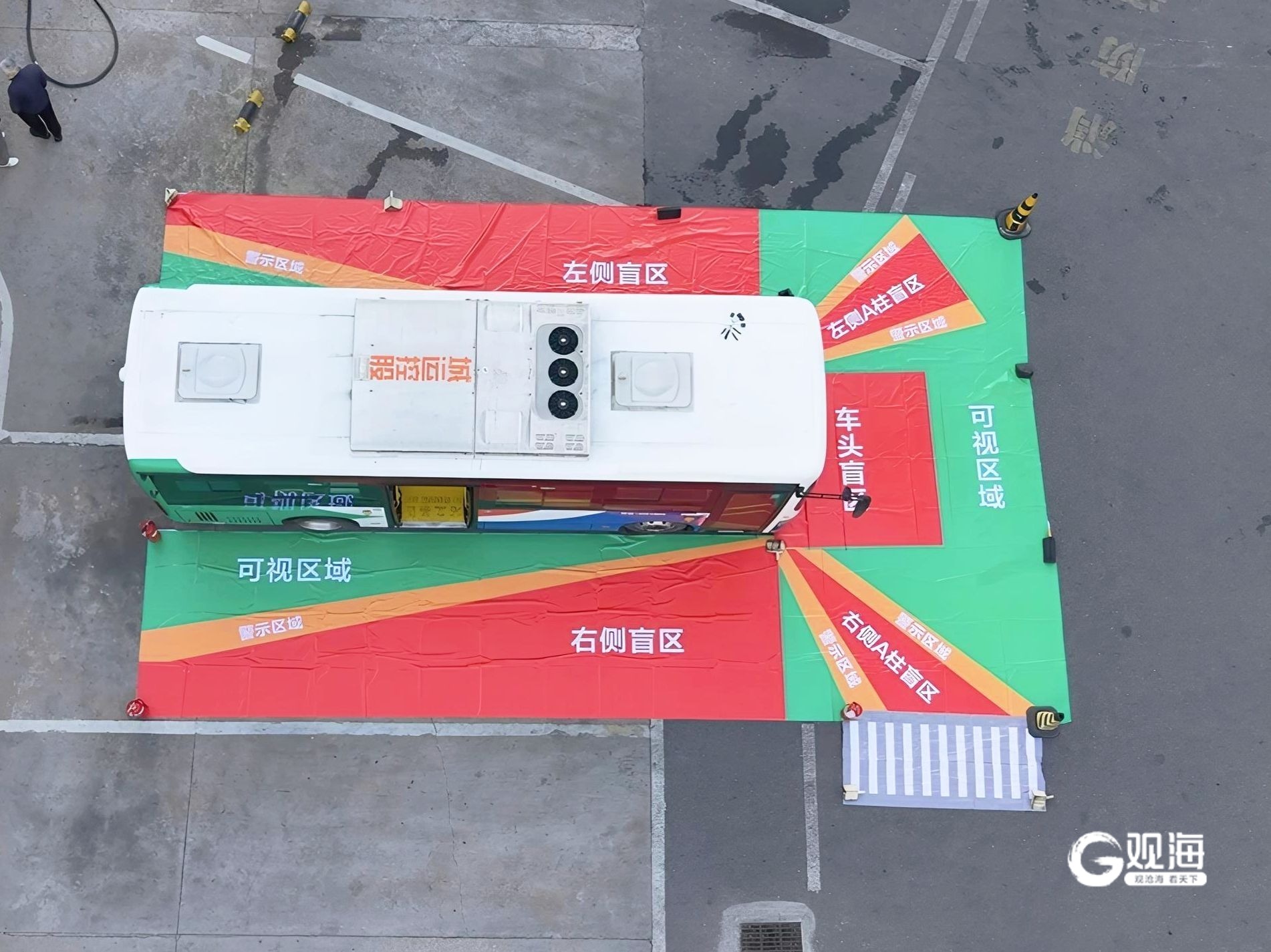 为突破这一瓶颈,市南巴士公司自主设计并制作了一套与实车比例完全一致的盲区示意地垫。该地垫可灵活铺设在公交车四周,通过醒目的颜色区分不同区域:绿色代表驾驶员可直接观察到的可视区域;黄色为警示区域,提示驾驶员有车辆或行人进入时需高度警惕;红色则标识出关键盲区,涵盖车头盲区、左右侧车身盲区及A柱盲区等视线死角。