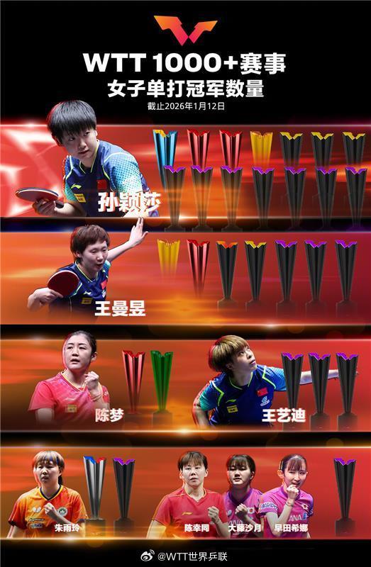 WTT1000+冠军榜更新,王楚钦、孙颖莎分列第一