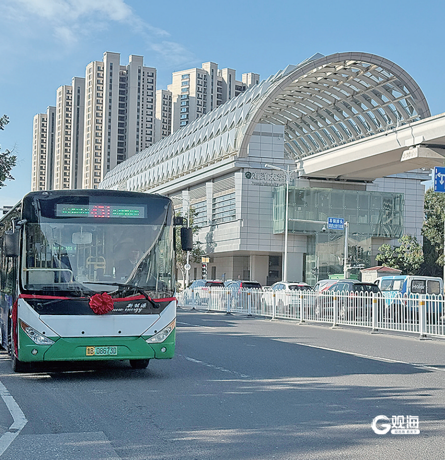 崂山区松岭路上,一辆公交车驶过地铁蓝谷快线海洋大学站。周建亮 摄