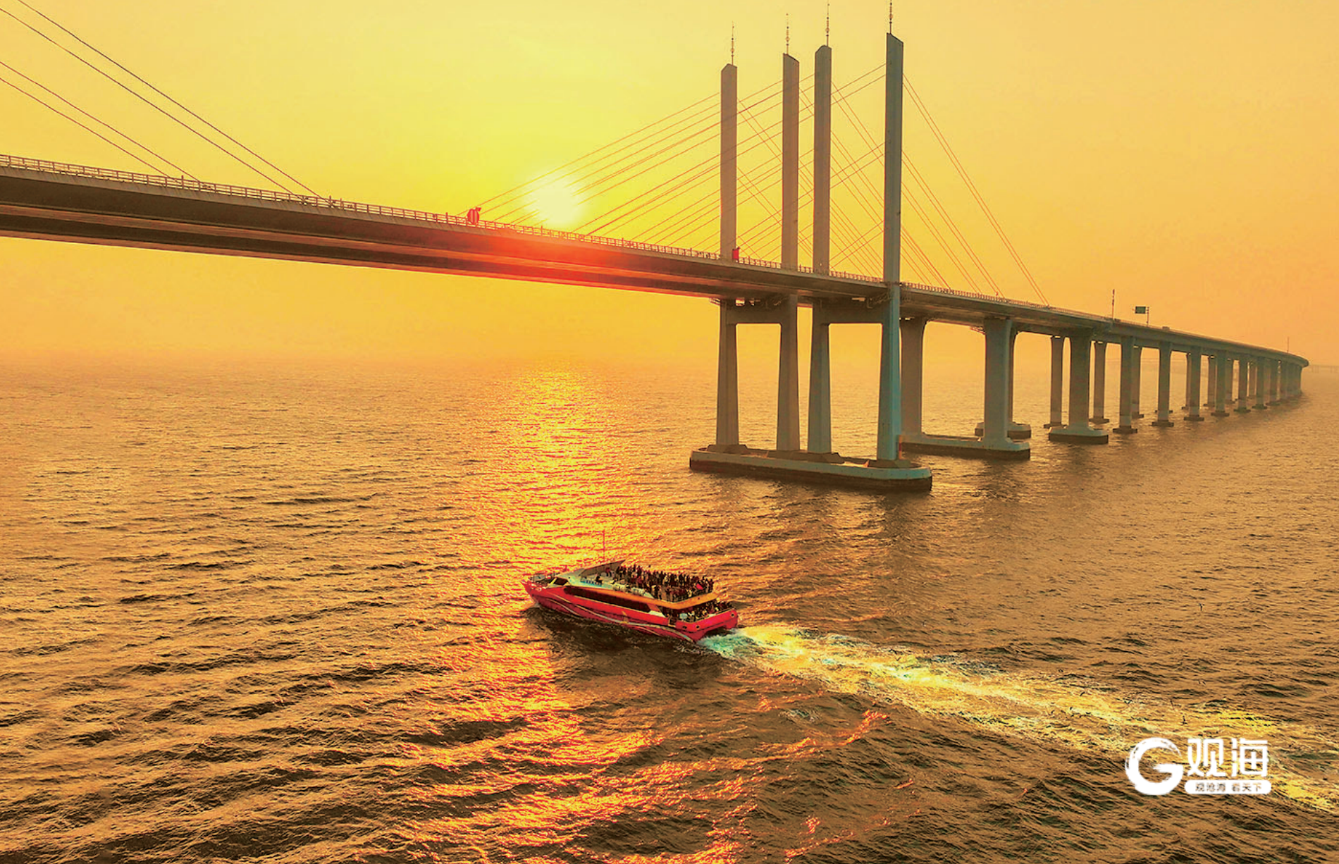 日落时分,浮光跃金,游客搭乘“海上穿越大桥”游船感受“橘子海”壮美景观。赵健鹏 摄