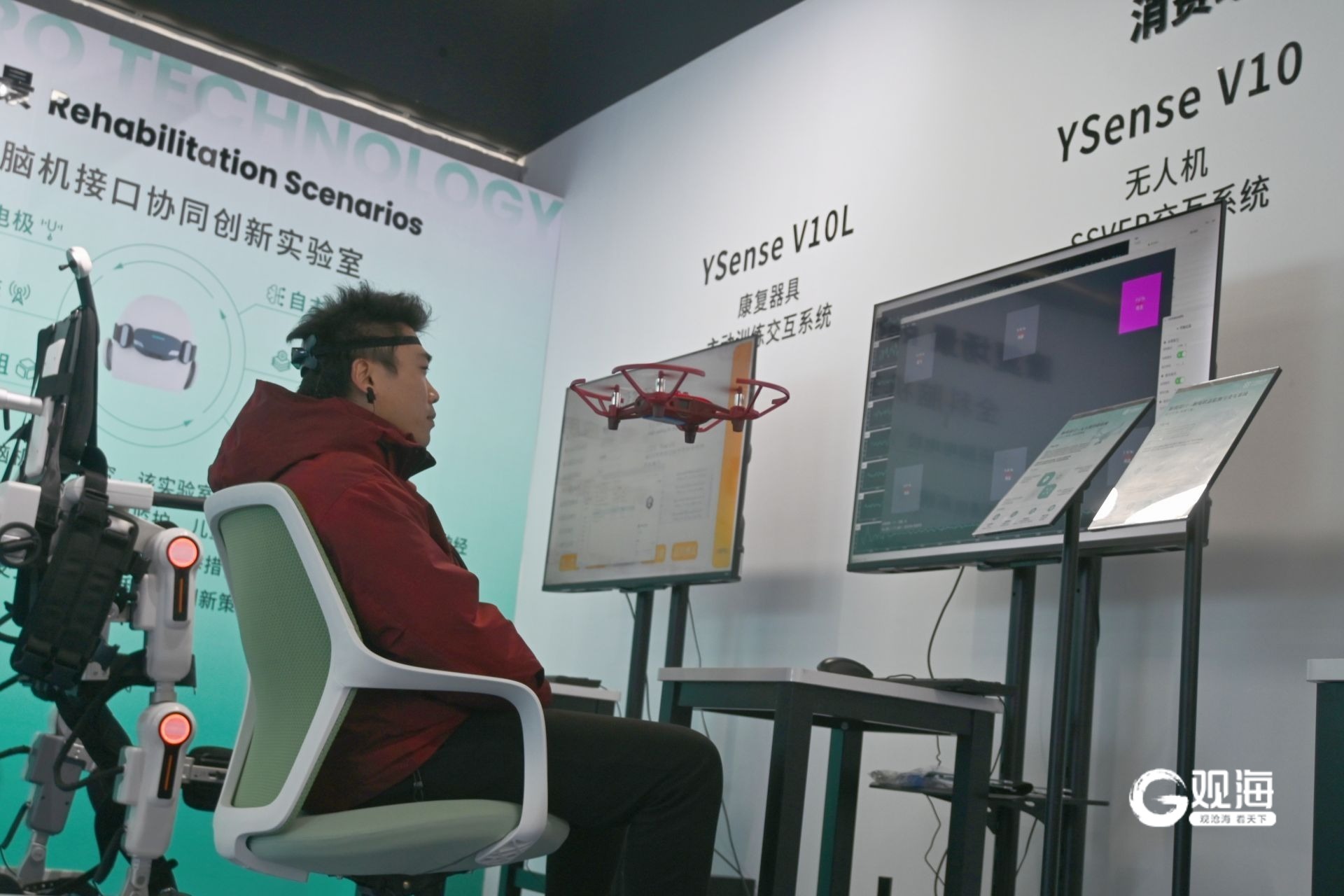 王文恺介绍,2025年9月参赛时,操作手需要配备脑帽,还需涂抹导电膏,每个接收点都由数据线连接。如今,元思(青岛)科技将自研医疗级半固态柔性电极材料应用于数据传输,脑帽进化成了可穿戴便携头环,导电性更优,佩戴更便捷舒适,极大提升了用户体验。硬件迭代的核心在于“前端”解码技术——即如何更清晰、更稳定、更抗干扰地从微伏级别的脑电“嘈杂对话”中,精准捕捉到关键信息。这离不开材料科学(电极)、生物工程(信号)、算法(解码)等交叉学科的高度融合。