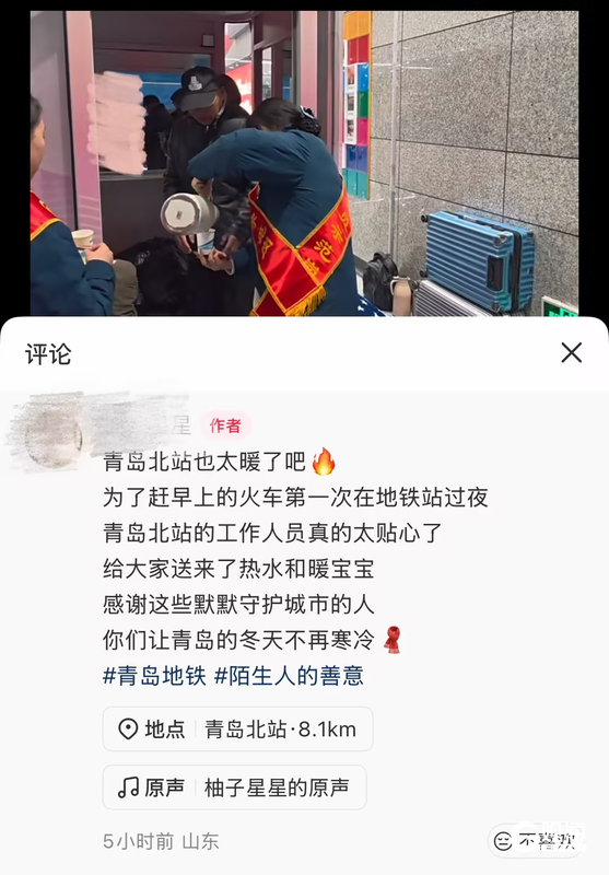 “谢谢青岛地铁,没想到这么晚了,地铁站工作人员还为我们送来了暖宝宝和热水。”一位旅客捧着热气腾腾的姜茶感慨道。许多乘客原本只是想在车站附近稍作等待,却意外收获了一份冬夜里的暖意。