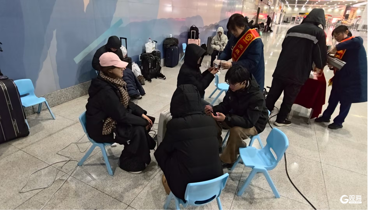 振华路站同样成为了一群人的“避风港”!今天上午,一批外来务工人员来到站内避寒。车站员工发现后,递上热水,并细心询问是否需要其他帮助。一杯热水、一句问候、一处可暂歇的温暖空间——这些看似平凡的举动,让风雪天变得不那么难熬。