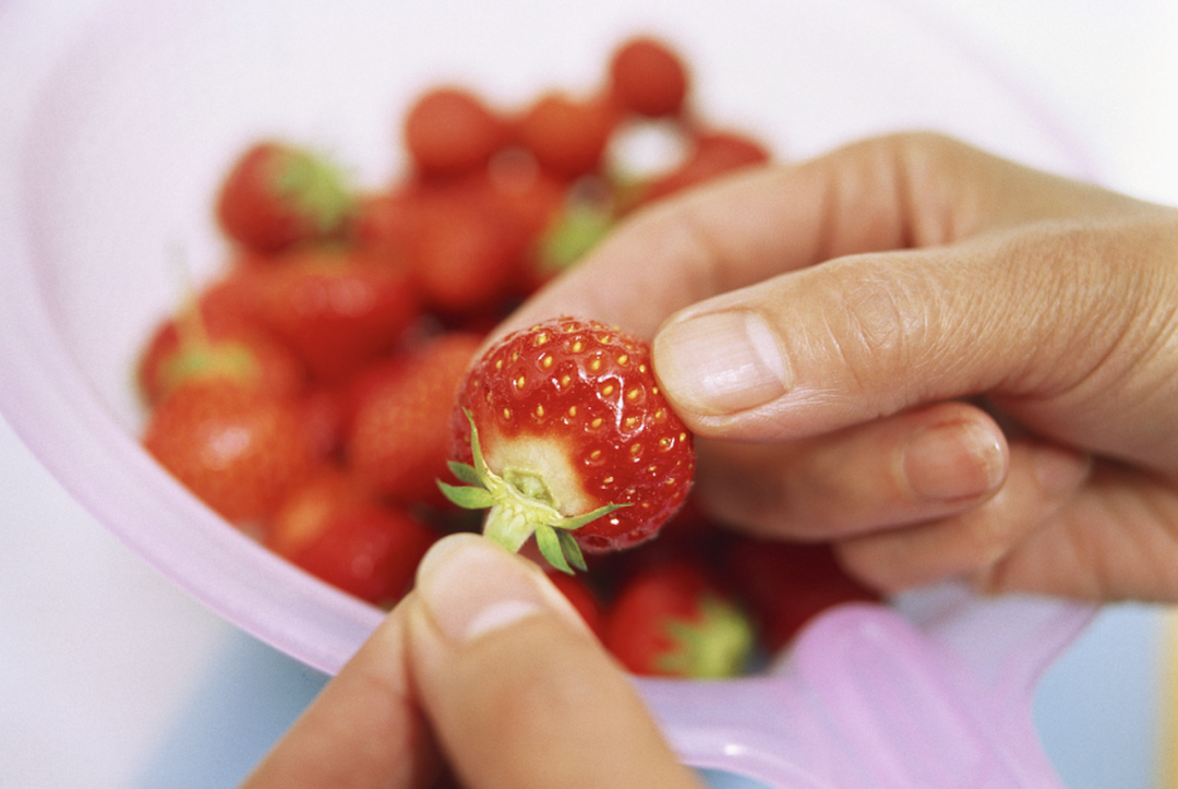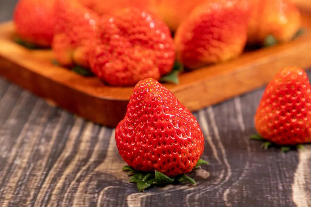 尝:自然熟的草莓肉质坚实、多汁、味道甜美,酸味不明显。如果草莓口感绵软或者干涩,意味着它过熟或者储存时间过长。