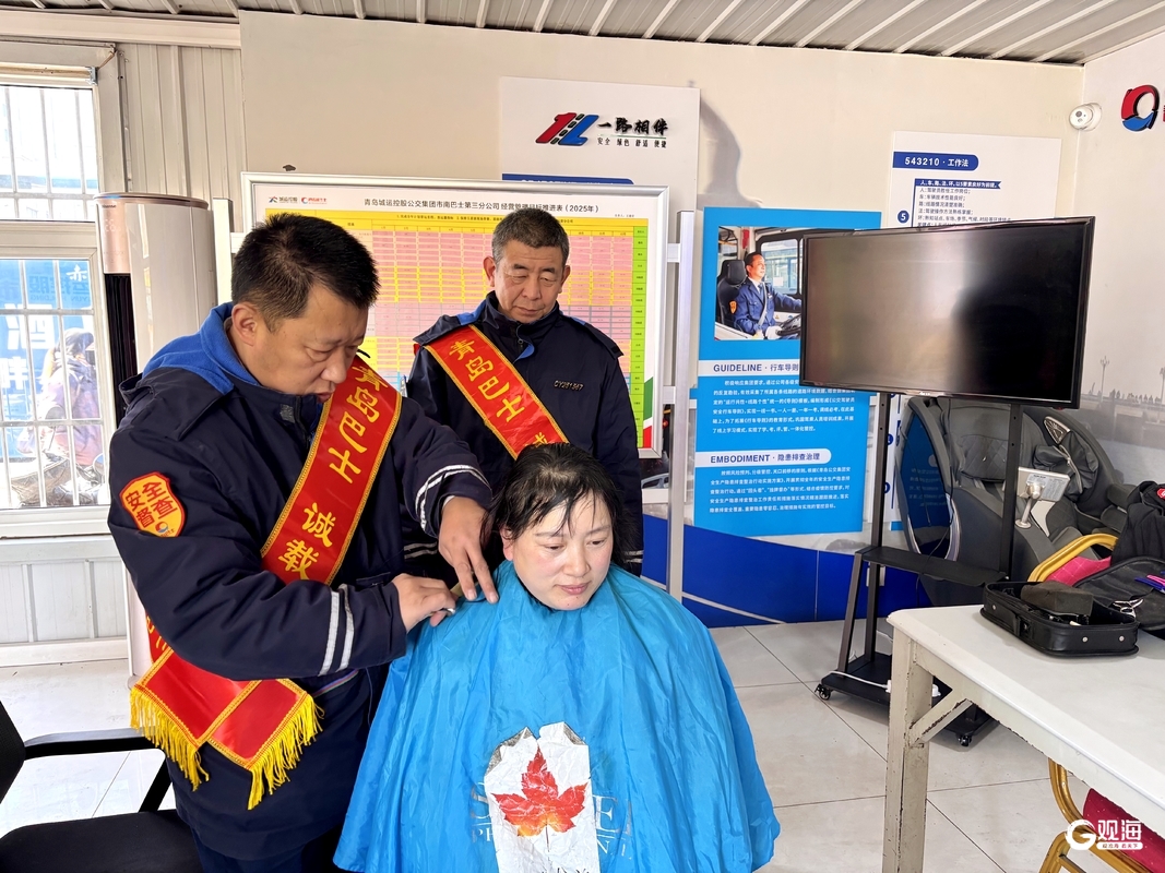 “青岛巴士”志愿者为环卫工人提供免费理发服务。