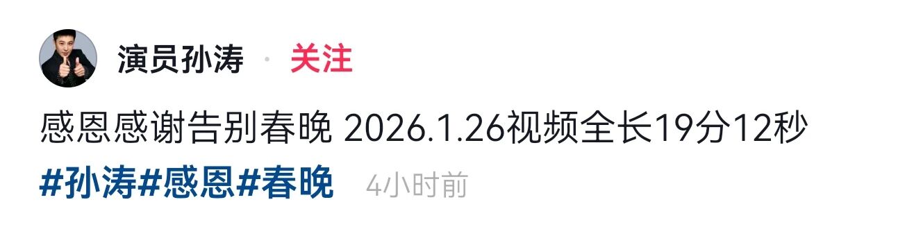 1月26日,演员孙涛再发视频,宣布将正式告别春晚舞台,孙涛称春晚对自己从艺一生非常重要,但个人能力有限,今后将不再参与春晚演出。