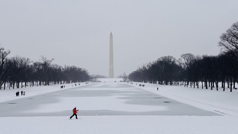 1月25日,人们在美国首都华盛顿林肯纪念堂倒影池旁的雪中行走。新华社记者徐剑梅摄