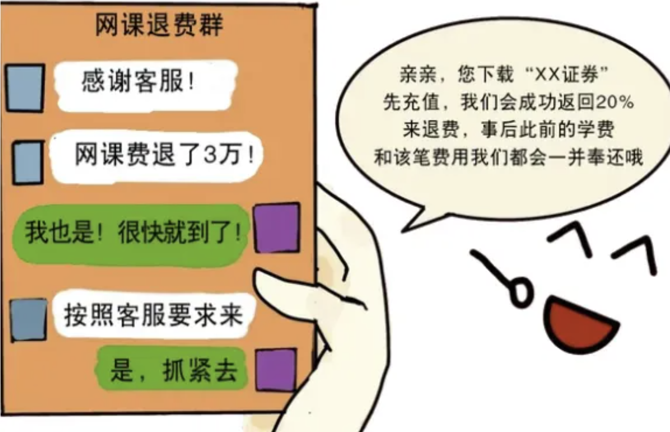 A市民收到顶端标有“全国12315平台”醒目字样的短信图片,标题为《一兆韦德退费公告》,声称清退学费。该市民联系“客服专员”后,被以“购买理财产品退费”“充值返利”“做任务”等名义骗走1.5万余元。