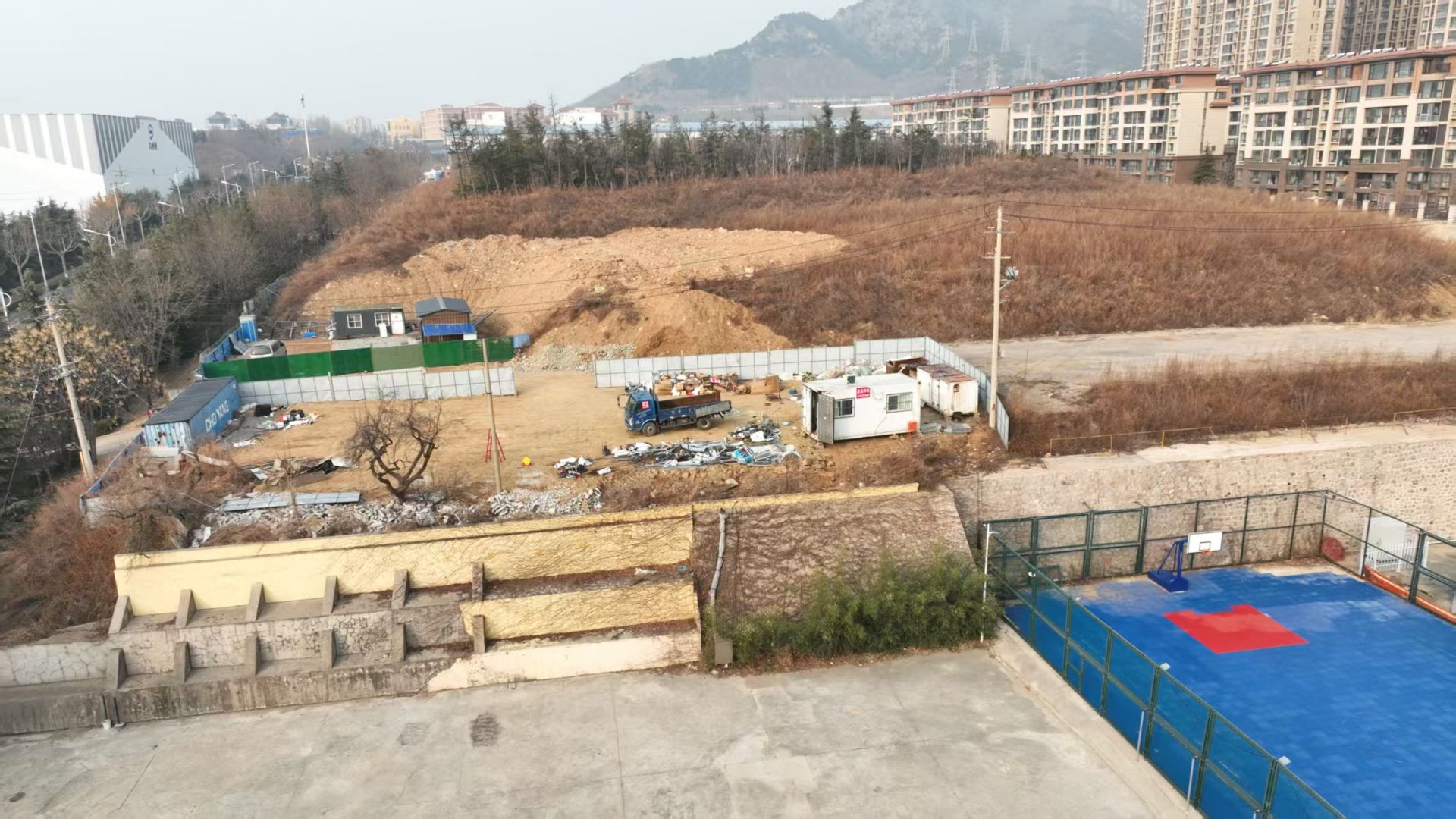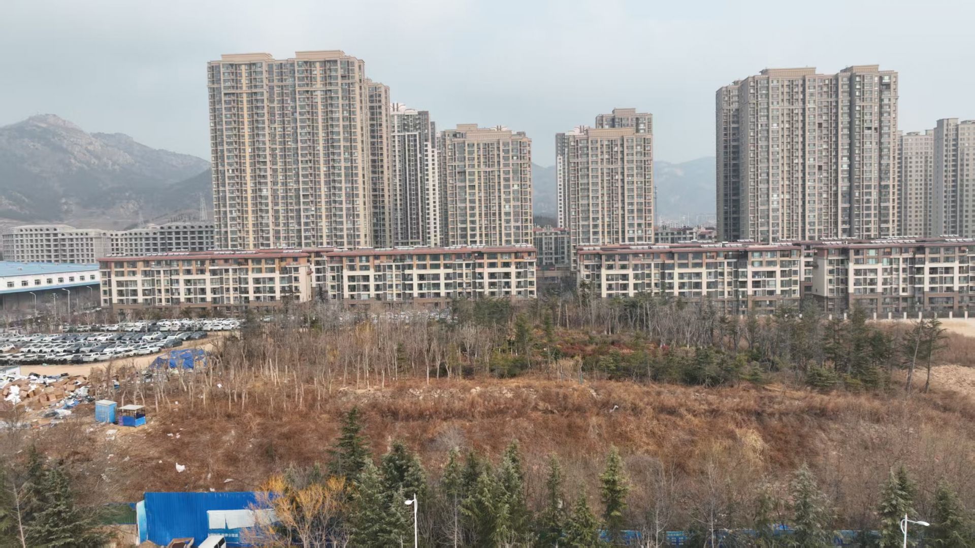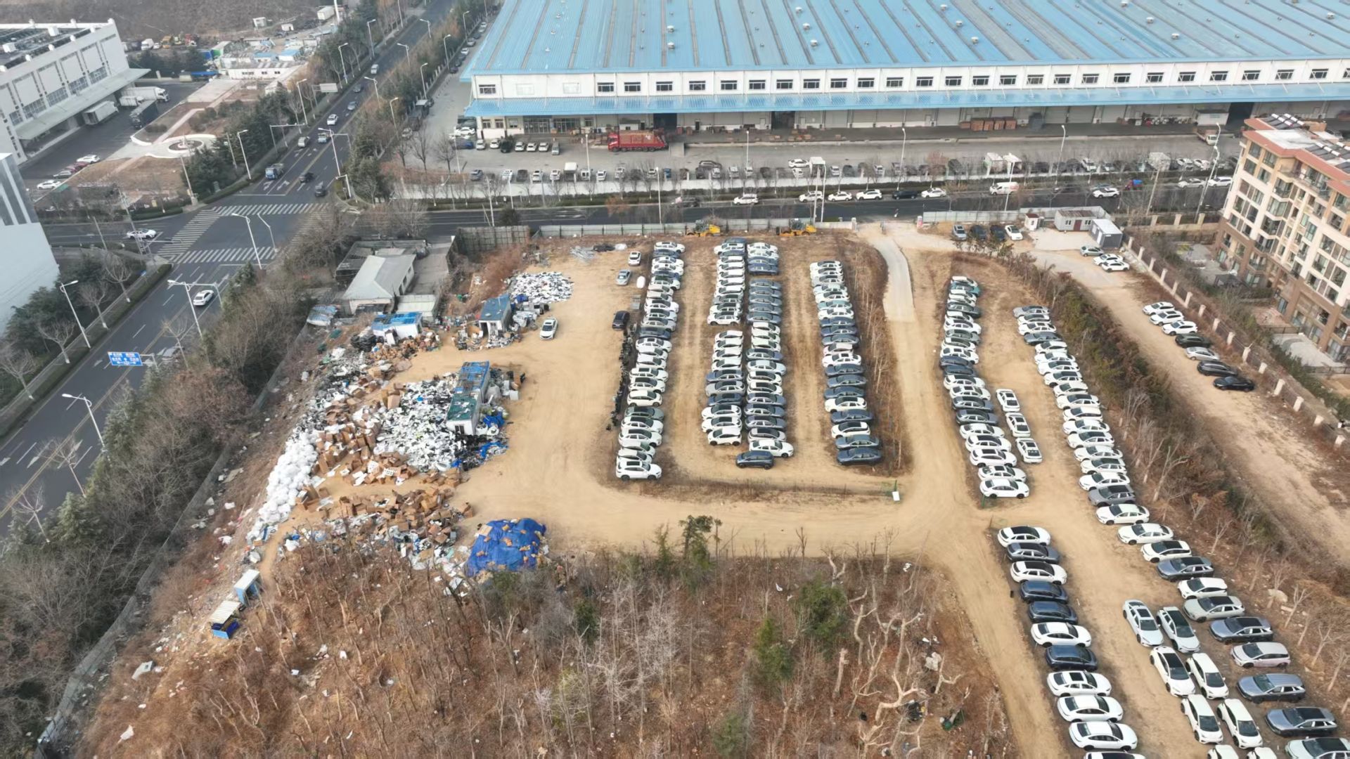近日,记者通过无人机镜头看到,该地块位于新城香溢紫郡-2期小区南侧,长约290米,宽达140米,其中,西侧部分停放大量私家车,中间部分栽种绿植,东侧部分为休闲空地和一处笼式篮球场。