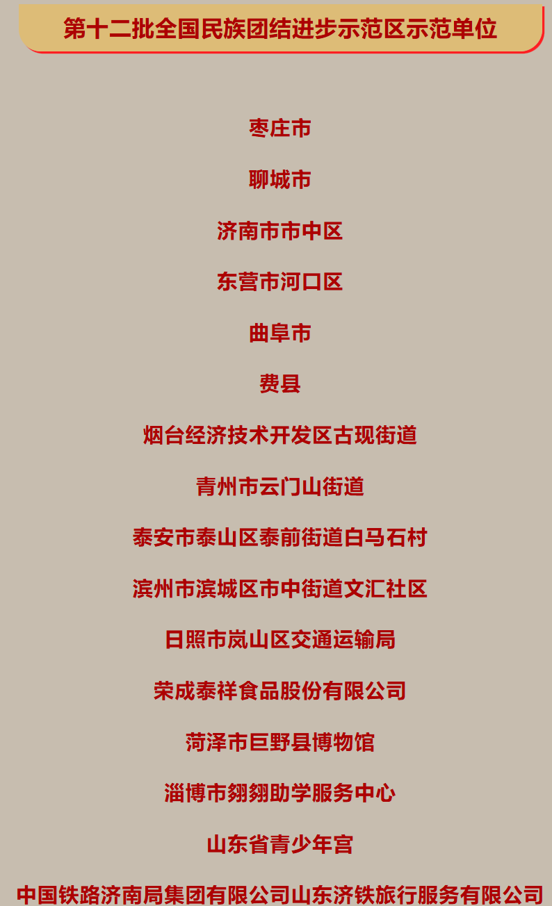 1月29日,记者从山东省民族宗教委获悉,全国488个地区和单位被命名为第十二批全国民族团结进步示范区示范单位。其中,山东省枣庄市、聊城市和日照市岚山区交通运输局等16个地区和单位被命名为第十二批全国民族团结进步示范区示范单位,命名有效期为5年。