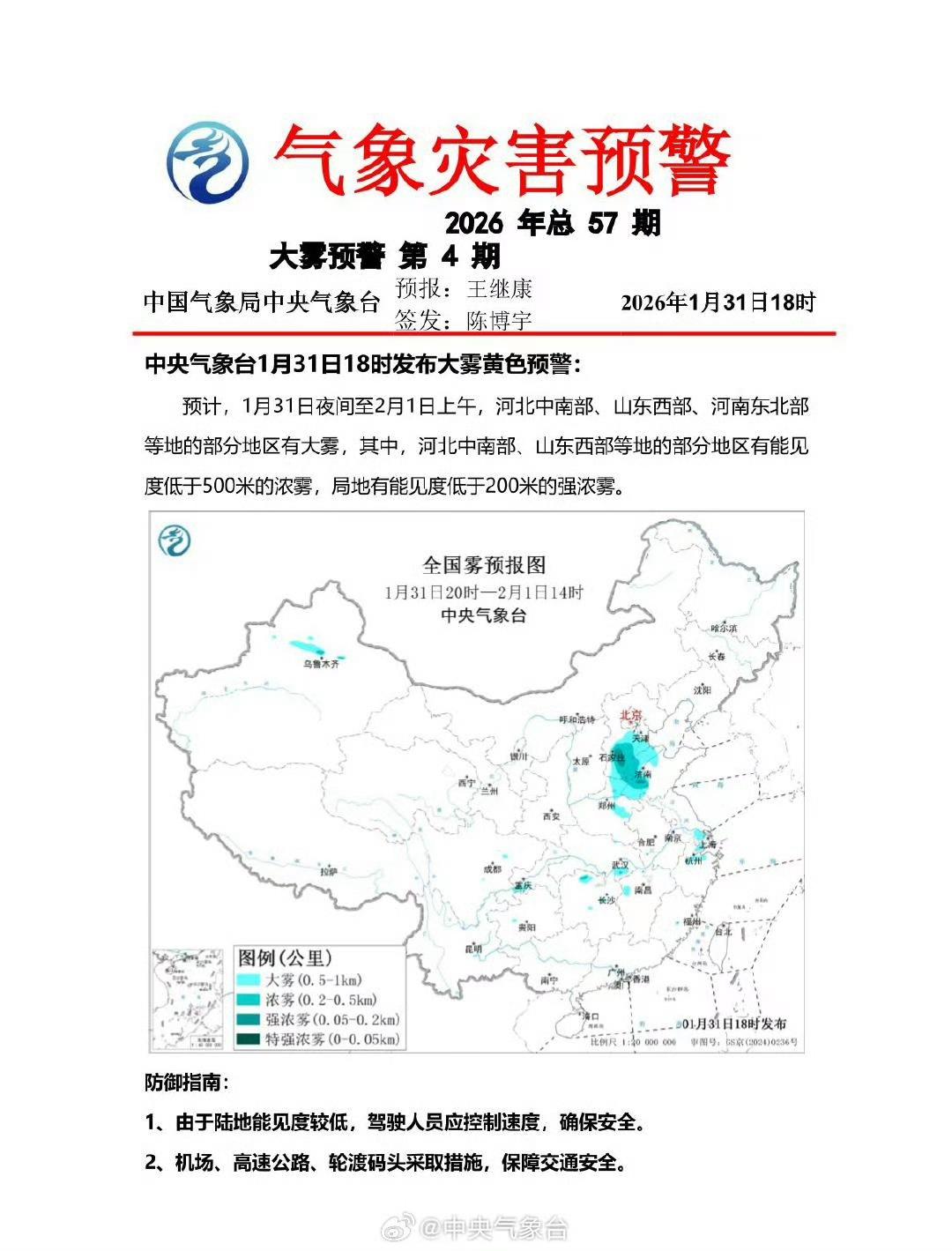 中央气象台1月31日18时发布大雾黄色预警。
