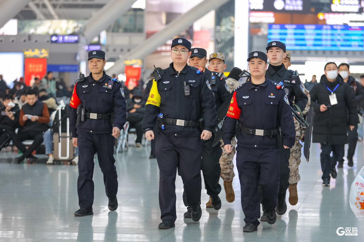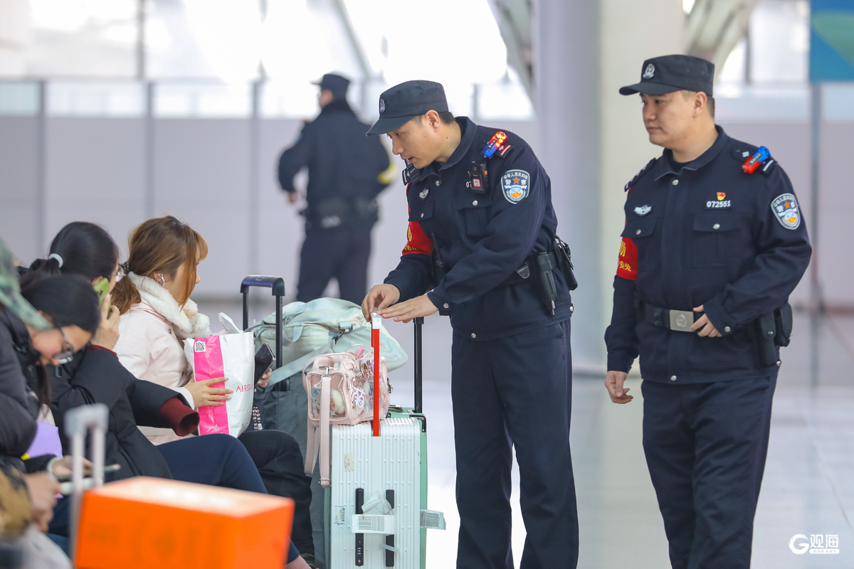 2月2日,在山东省青岛火车北站,青岛北站派出所民警、辅警在候车室执勤巡逻。
