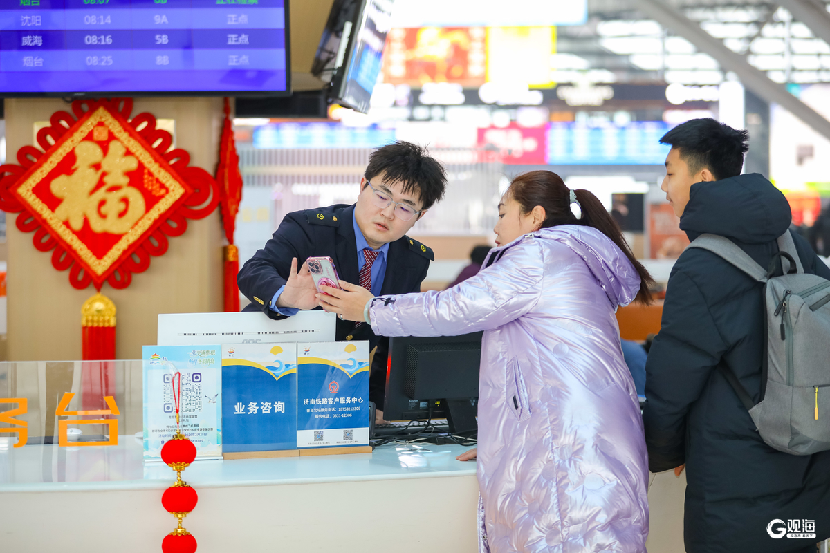 2月2日,在山东省青岛火车北站,工作人员为旅客解答出行问题。
