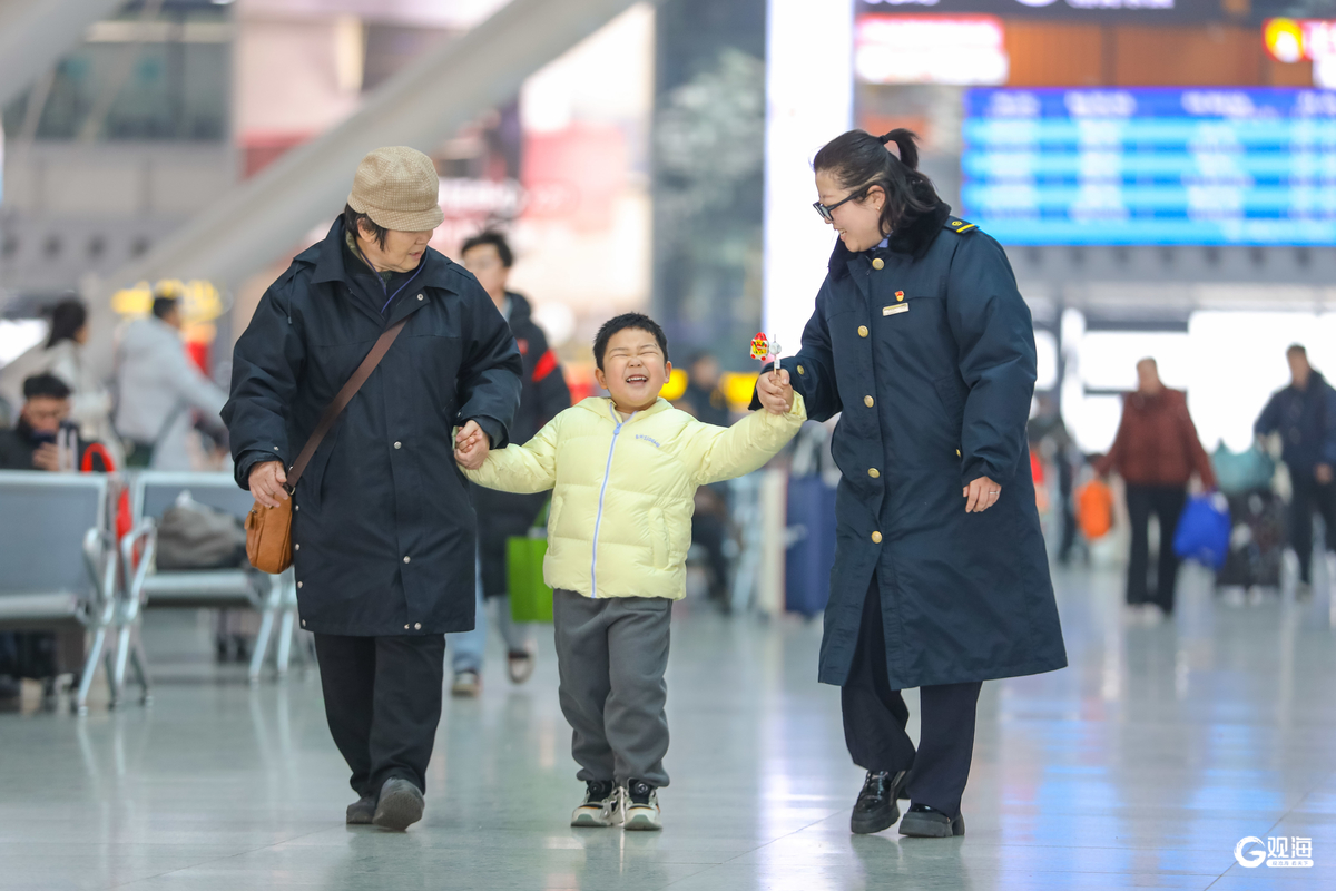2月2日,在山东省青岛火车北站,工作人员帮助旅客乘车出行。