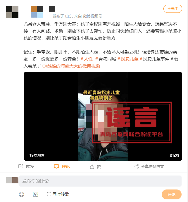 近日,一则“最近青岛拐卖儿童事件特别多”的信息在网络平台传播,引起部分网民恐慌,造成不良社会影响。经核实,该信息纯属谣言。造谣者张某编造、传播虚假信息,扰乱公共秩序,被依法予以行政处罚。