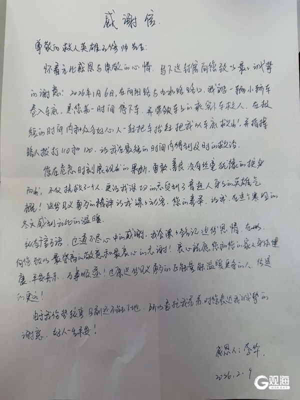 伤者李女士被紧急送往医院后,经全力救治脱离了生命危险。治疗期间,她始终不忘那位素未谋面的救命恩人。通过社交媒体得知施救者是王修帅后,她强忍病痛,亲手写下一封情真意切的感谢信:“您在危急时刻展现的果断、善良、勇敢,没有丝毫犹豫的挺身而出,不仅挽救了一个人,更让我深切地感受到了普通人身上的英雄气概!”信中字字句句都饱含着其对王修帅的感激之情,字迹虽因虚弱而略显颤抖,却承载着最真挚的敬意。