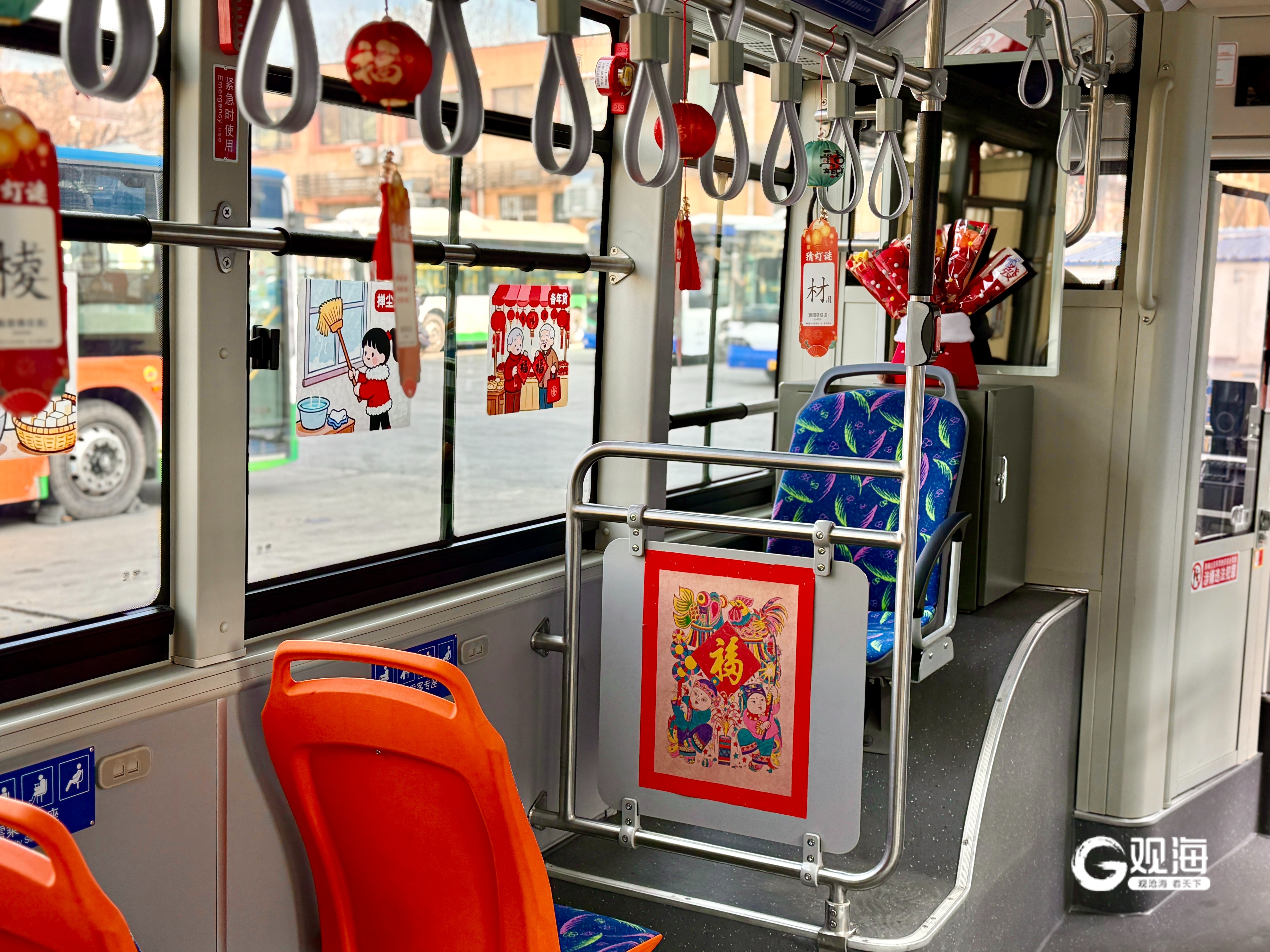步入115路DD2527号车,记者便被浓厚的“年味”给紧紧包裹……五颜六色地灯笼悬挂在了上方扶手杆处,车厢内贴满年画,传统韵味十足。