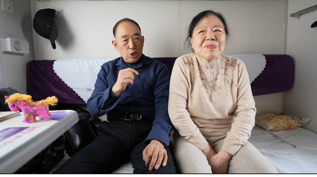 记者在“齐鲁1号”列车上蹲点采访的时候,遇到了这对老两口,他俩正坐着这趟车到处逛逛,这是丈夫——75岁黄绪惠的主意。老两口结婚48年了,在春节期间反向旅行,也不单单是看个热闹。妻子朱淑英说:“我有时候可能是年龄大了,有时候心里纠结什么,有点紧张了,有点焦虑,这次出来之后呢,坏情绪散了。”