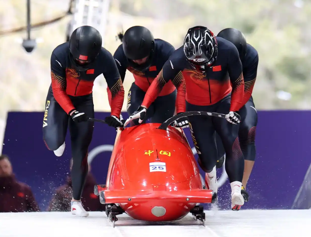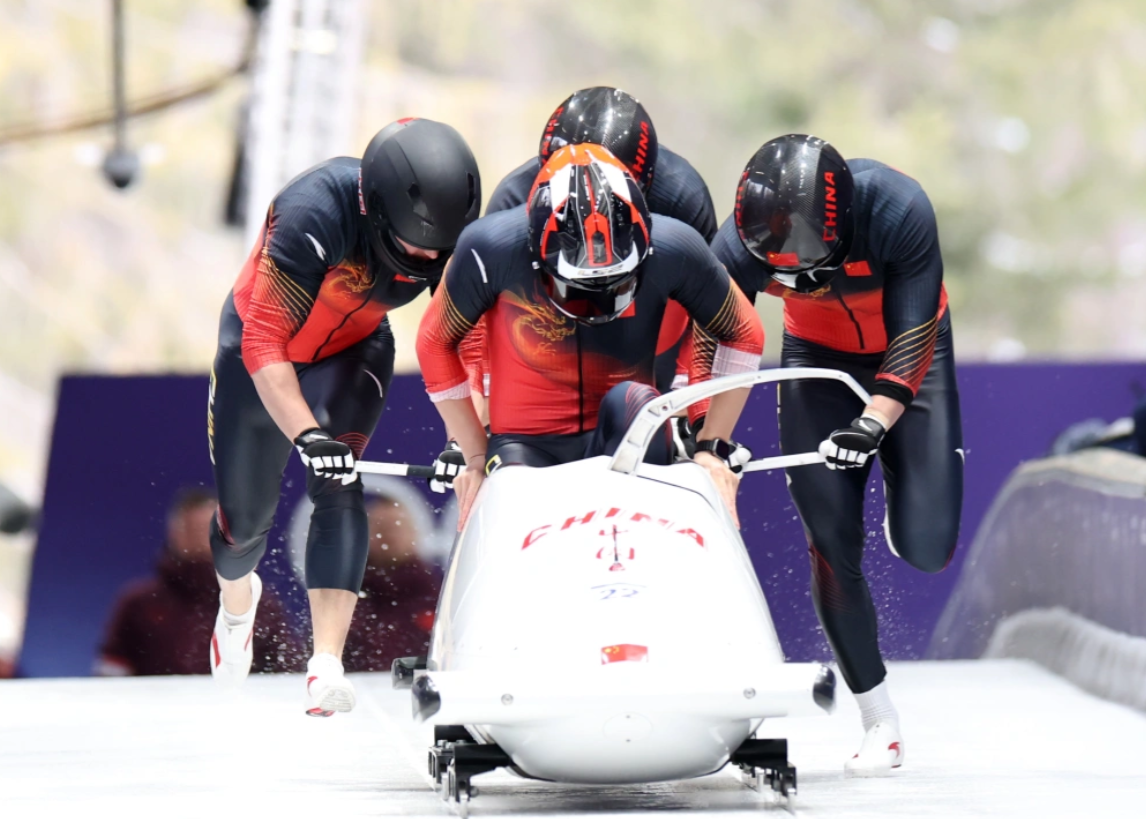 当地时间2月21日,中国队选手李纯键、姜茂源、叶杰龙、丁运达组成的四人车组参加比赛。他们在两轮比赛后暂列第18名。