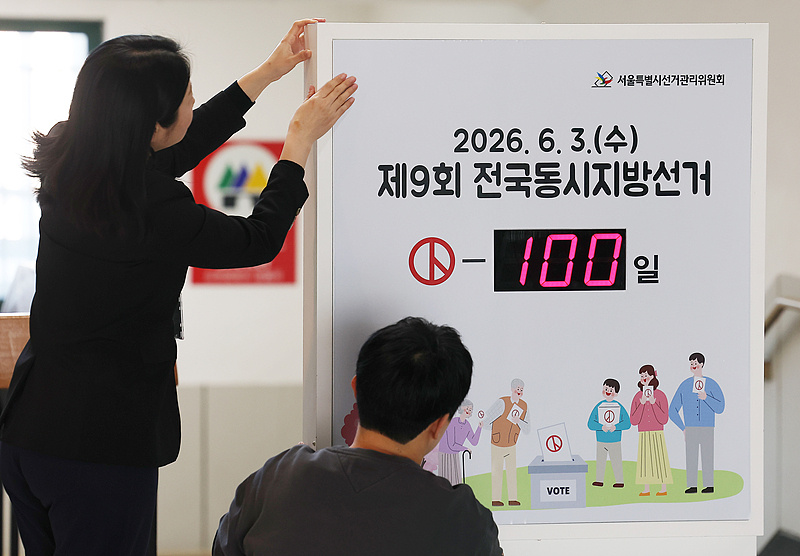 △当地时间2月23日,韩国首尔特别市选举管理委员会工作人员在全国地方选举倒计时100天之际张贴宣传板贴纸。