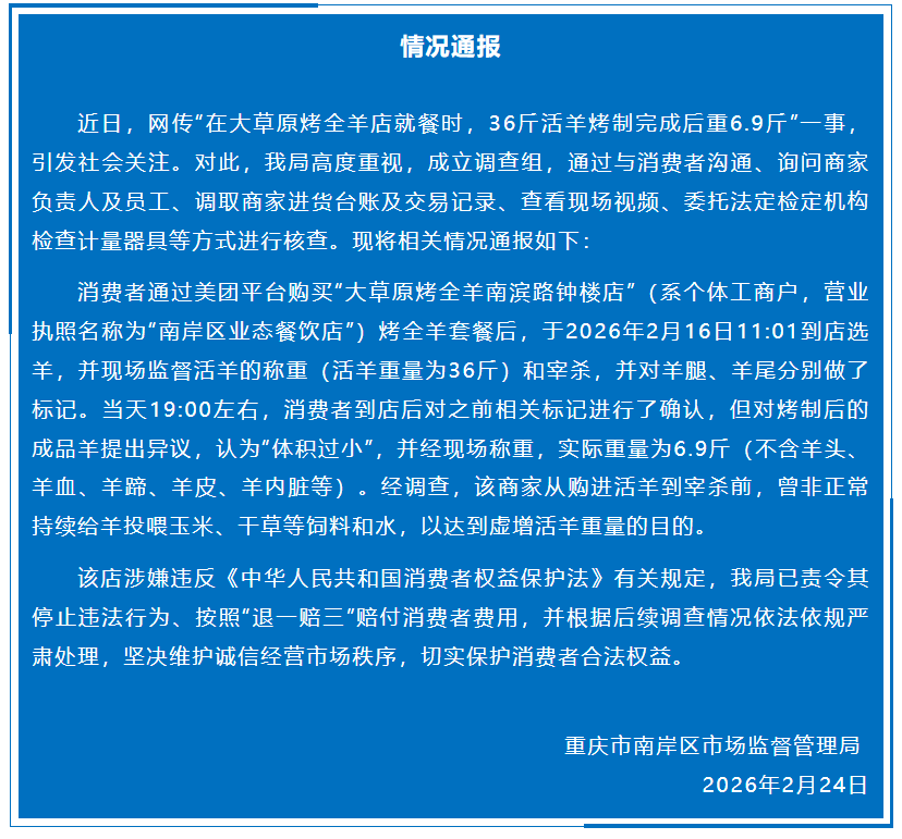 消费者通过美团平台购买“大草原烤全羊南滨路钟楼店”(系个体工商户,营业执照名称为“南岸区业态餐饮店”)烤全羊套餐后,于2026年2月16日11:01到店选羊,并现场监督活羊的称重(活羊重量为36斤)和宰杀,并对羊腿、羊尾分别做了标记。当天19:00左右,消费者到店后对之前相关标记进行了确认,但对烤制后的成品羊提出异议,认为“体积过小”,并经现场称重,实际重量为6.9斤(不含羊头、羊血、羊蹄、羊皮、羊内脏等)。经调查,该商家从购进活羊到宰杀前,曾非正常持续给羊投喂玉米、干草等饲料和水,以达到虚增活羊重量的目的。