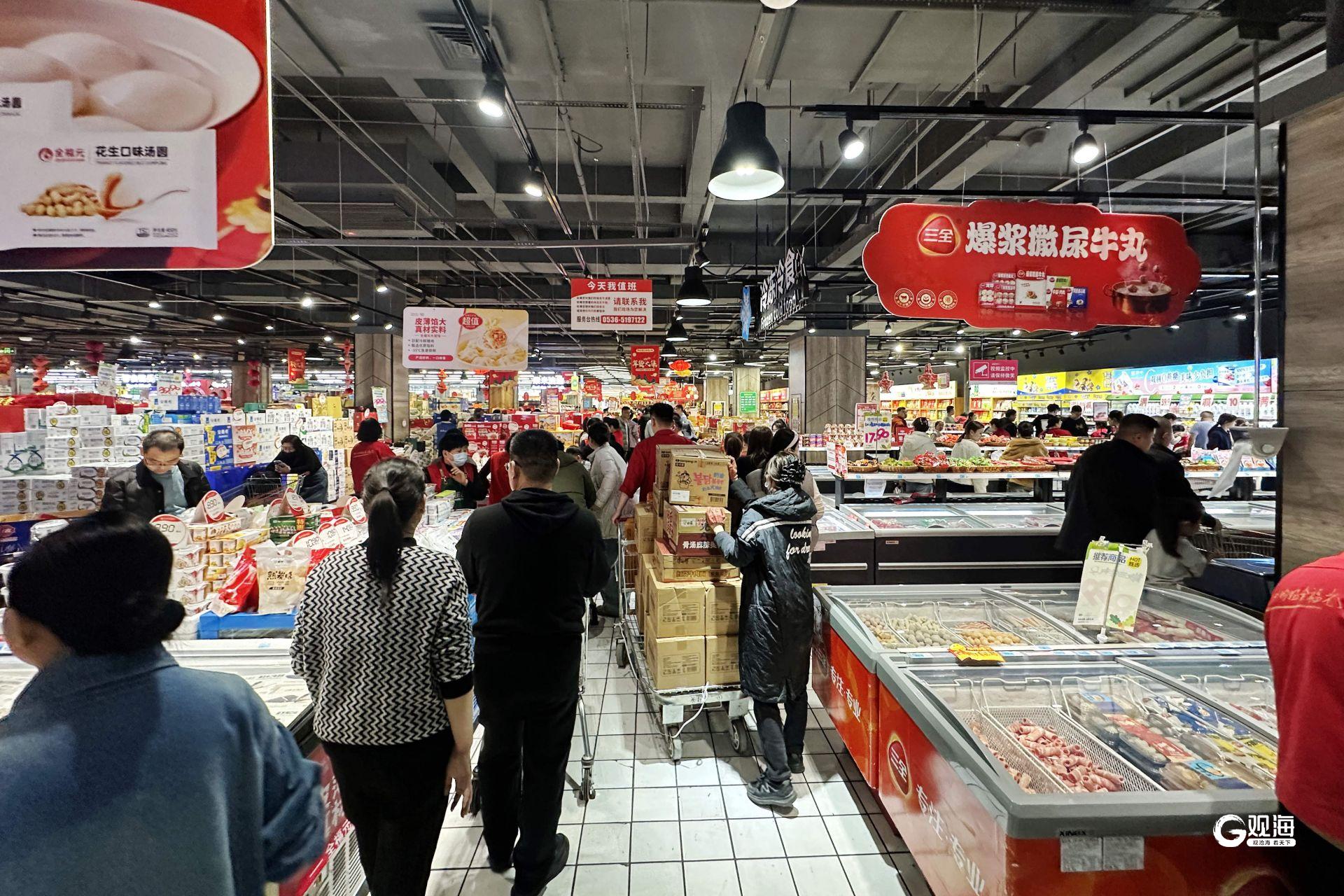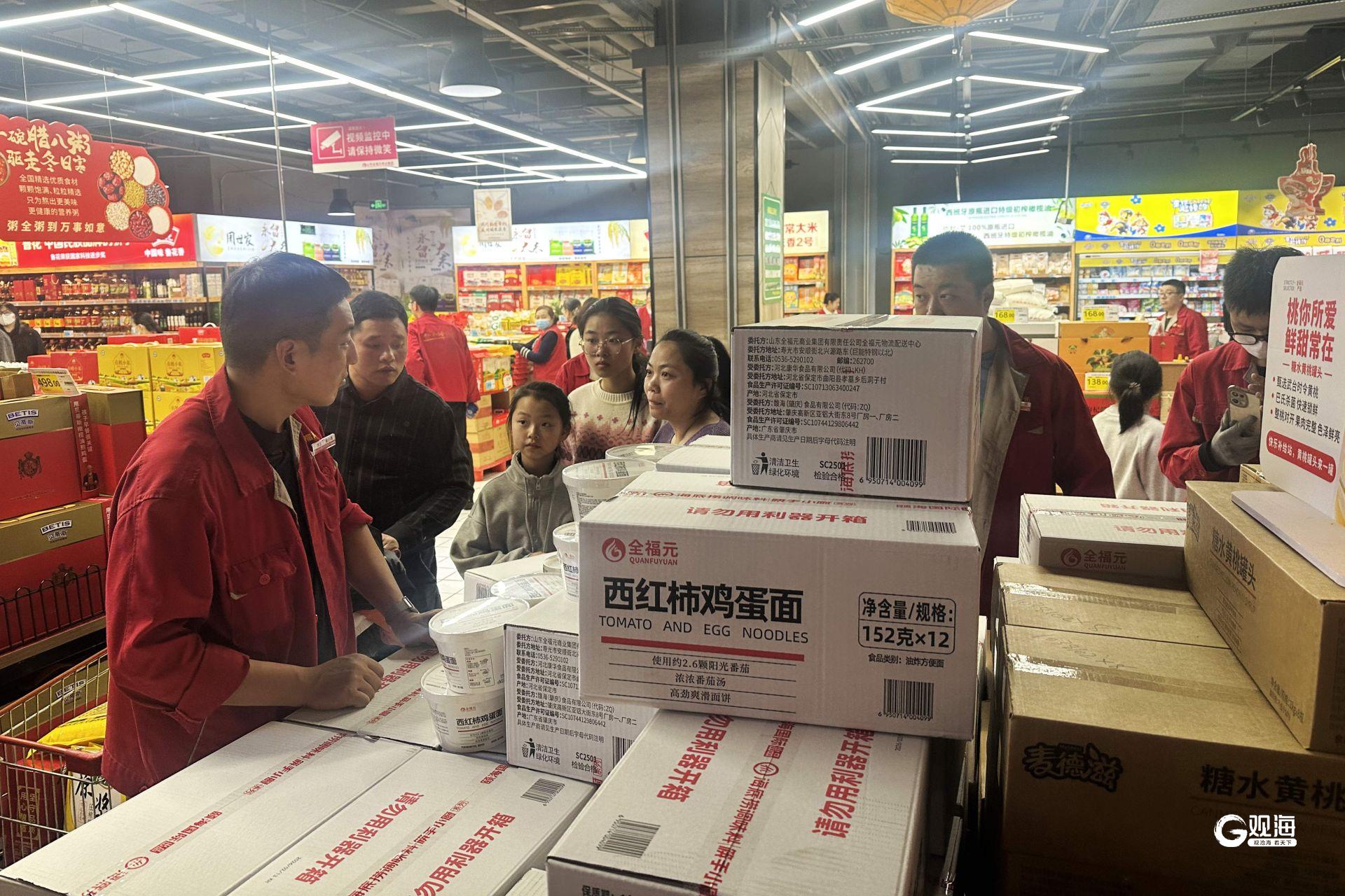 顾客蜂拥而至,三名超市员工忙得团团转,“每箱12桶,我们一家超市,一天就能卖1000箱。”