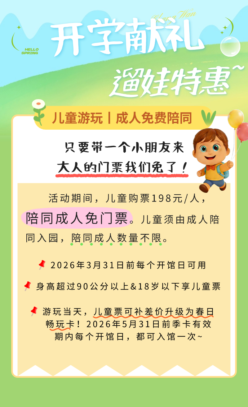 春回大地,新学期如约而至。近日,记者从海信探索中心获悉,为庆祝开学季,园区推出推出“开学献礼”亲子特惠活动:即日起至2026年3月31日,每个开馆日儿童购票仅需198元/人,且每位儿童可由多名成人免费陪同入园,让家庭出游更轻松、更实惠。 责任编辑:王臻 0