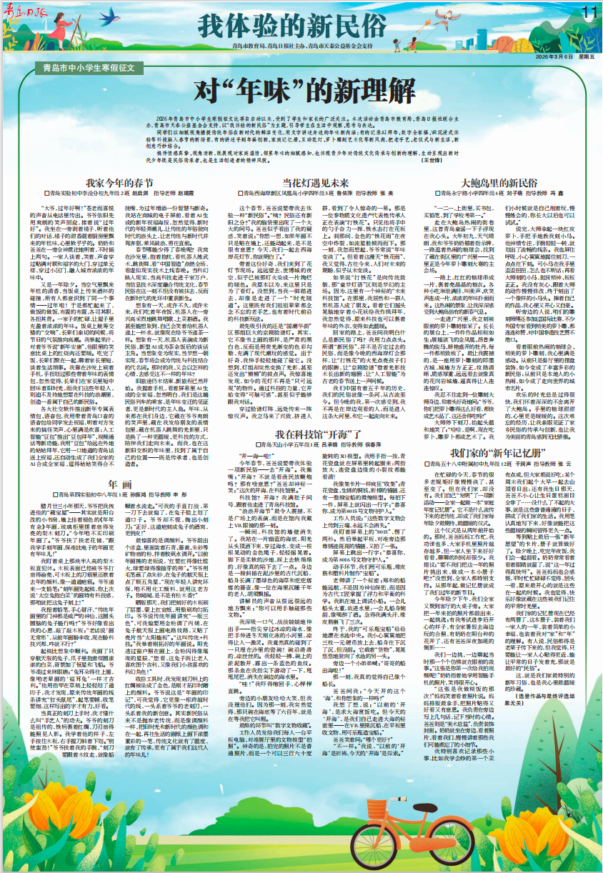 青岛日报社/观海新闻3月6日讯 寒假刚刚结束,而由青岛市教育局、青岛日报社联合主办,青岛市天泰公益基金会支持的2026年青岛市中小学生寒假征文比赛还在火热进行中。此次征文主题是“我体验的新民俗”。