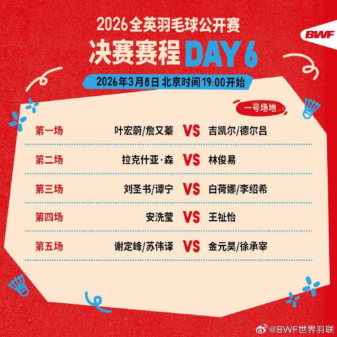 今天(3月8日),2026全英羽毛球公开赛进入第6个比赛日,晚上七点起将进行多项决赛。其中: 女双决赛:中国组合刘圣书/谭宁将对阵韩国组合白荷娜/李绍希 女单决赛:中国选手王祉怡将对阵韩国选手安洗莹 今日赛程公布 责任编辑:王逸群 0