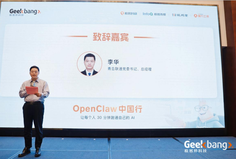 3月21日,由极客邦科技主办的“OpenClaw中国行·青岛站”活动在青岛威斯汀酒店隆重举行。本次活动由青岛市人工智能产业协会、中国联通青岛分公司(以下简称“青岛联通”)、中欧校友会青岛分会、中泰信合智能科技有限公司、文泰商学等单位联合承办,吸引了来自全国的450多位AI技术专家、创业者、产业代表及投资机构齐聚青岛,共同探讨AI时代“超级个体”(OPC,One-Person Company)与数字经济融合发展的新路径。